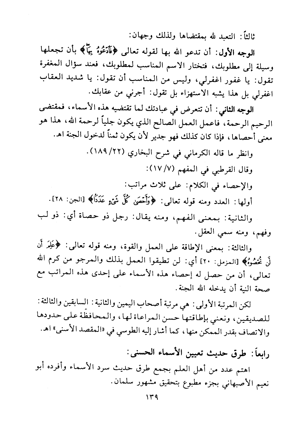 الوجه الثاني: أن تتعرض في عبادتك لما تقتضيه هذه الأسماء، فمقتضى الرحيم الرحمة، فاعمل العمل الصالح الذي يكون جلياً لرحمة الله، هذا هو معنى أحصاها، فإذا كان كذلك فهو جدير لأن يكون ثمناً لدخول الجنة ا. هـ.