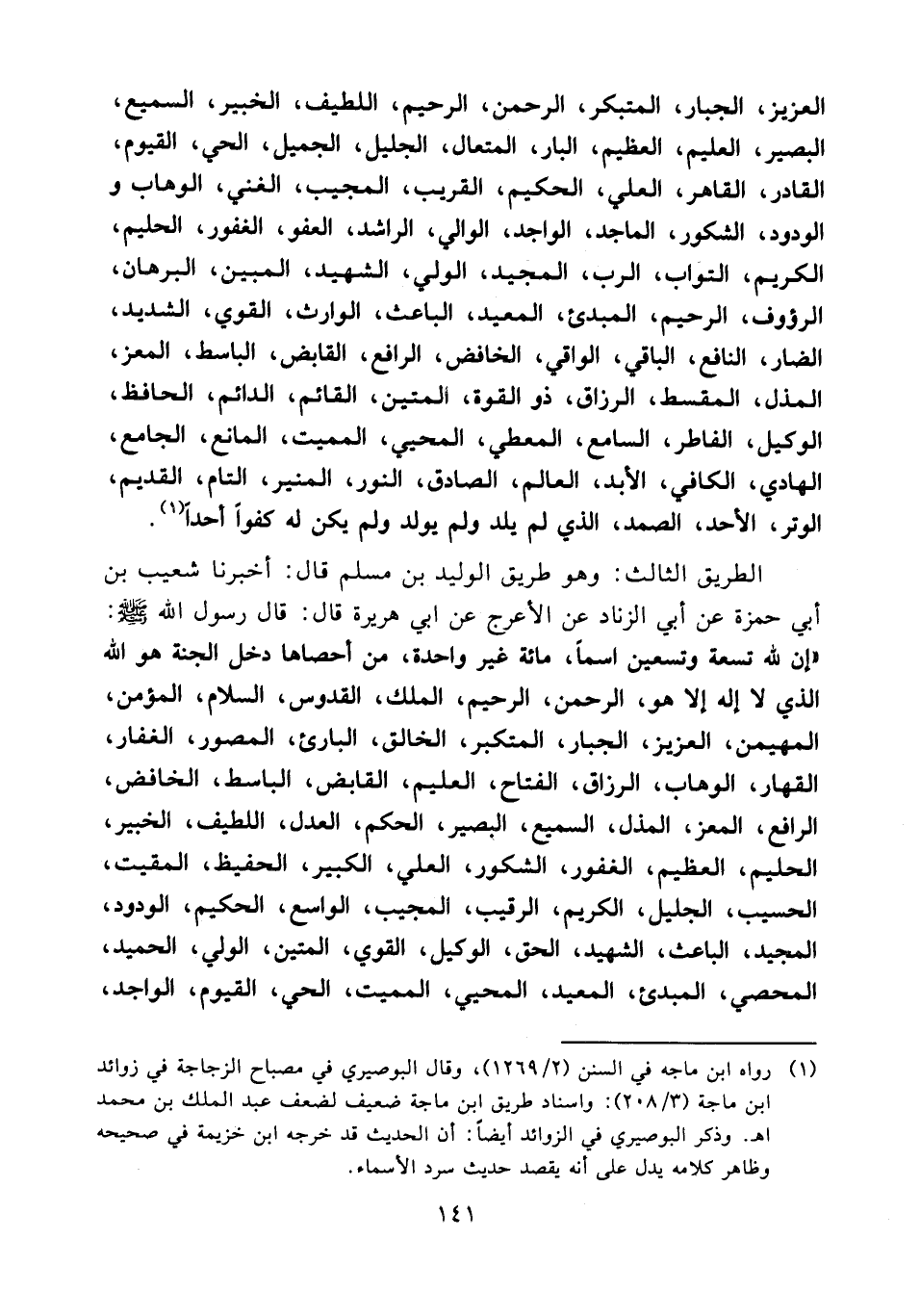 الطريق الثالث: وهو طريق الوليد بن مسلم قال: أخبرنا شعيب بن أبي حمزة عن أبي الزناد عن الأعرج عن أبي هريرة قال: قال رسول الله صلى الله عليه وسلم: " إن لله تسعة وتسعين اسماً، مائة غير واحدة، من أحصاها دخل الجنة هو الله الذي لا إله إلا هو، الرحمن، الرحيم، الملك، القدوس، السلام، المؤمن؛ المهيمن، العزيز، الجبار، المتكبر، الخالق، الباريء، المصور، الغفار، القهار، الوهاب، الرزاق، الفتاح، العليم، القابض، الباسط، الخافض، الرافع، المعز، المذل، السميع، البصير، الحكم، العدل، اللطيف، الخبير، الحليم، العظيم، الغفور، الشكور، العلي، الكبير، الحفيظ، المقيت، الحسيب، الجليل، الكريم، الرقيب، المجيب، الواسع، الحكيم، الودود، المجيد، الباعث، الشهيد، الحق، الوكيل، القوي، المتين، الولى، الحميد، المحصي، المبدىء، المعيد، المحيي، المميت، الحي، القيوم، الواجد،