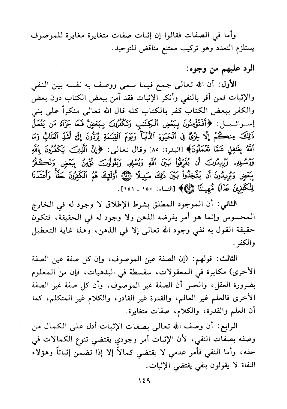 الأول: أن الله تعالى جمع فيما سمى ووصف به نفسه بين النفي والإثبات فمن أقر بالنفي وأنكر الإثبات فقد آمن ببعض الكتاب دون بعض والكفر ببعض الكتاب كفر بالكتاب كله قال الله تعالى منكراً على بني إسرائيل: {أفتؤمنون ببعض الكتاب وتكفرون ببعض فما جزاء من يفعل ذلك منكم إلا خزي في الحياة الدنيا ويوم القيامة يردون إلى أشد العذاب وما الله بغافل عما تعملون} [البقرة: 85] وقال تعالى: {إن الذين يكفرون بالله ورسله ويريدون أن يفرقوا بين الله ورسله ويقولون نؤمن ببعض ونكفر ببعض ويريدون أن يتخذوا بين ذلك سبيلاً أولئك هم الكافرون حقاً واعتدنا للكافرين عذاباً مهيناً} [النساء: 150] .