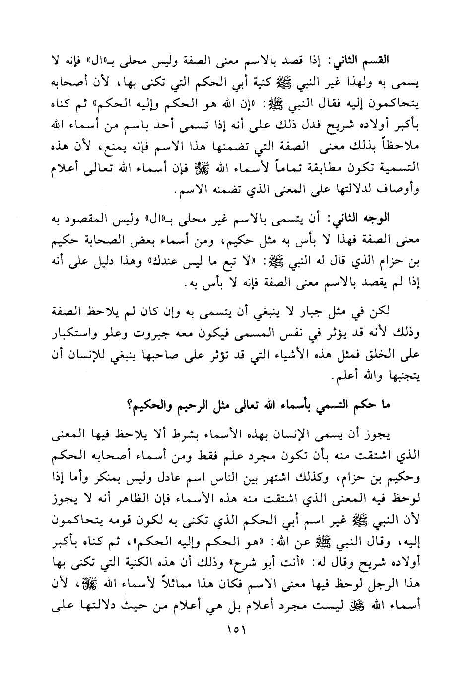 القسم الثاني: إذا قصد بالاسم معنى الصفة وليس محلى بـ " ال " فإنه لا يسمى به ولهذا غير النبي صلى الله عليه وسلم كنية أبي الحكم التي تكنى بها، لأن أصحابه يتحاكمون إليه فقال النبي صلى الله عليه وسلم " إن الله هو الحكم وإليه الحكم " ثم كناه بأكبر أولاده شريح فدل ذلك على أنه إذا تسمى أحد باسم من أسماء الله ملاحظاً بذلك معنى الصفة التي تضمنها هذا الاسم فإنه يمنع، لأن هذه التسمية تكون مطابقة تماماً لأسماء الله سبحانه وتعالى فإن أسماء الله تعالى أعلام وأوصاف لدلالتها على المعنى الذي تضمنه الاسم.