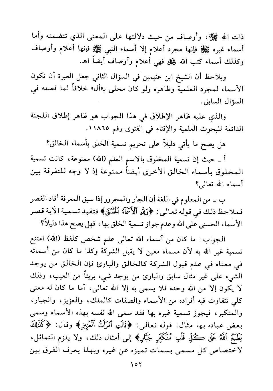 ويلاحظ أن الشيخ ابن عثيمين في السؤال الثاني جعل العبرة أن تكون الأسماء لمجرد العلمية وظاهره ولو كان محلى بأل خلافاً لما فصله في السؤال السابق.
