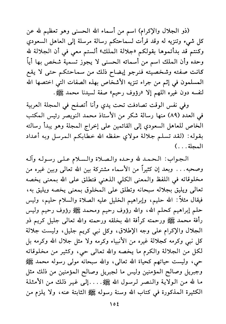 (ذو الجلال والإكرام) اسم من أسماء الله الحسنى وهو تعظيم لله عن كل شيء وتنزيه له وقد قرأت لسماحتكم رسالة مرسلة إلى العاهل السعودي وكنتم قد بدأتموها بقولكم " جلالة الملك " ألستم معي في أن الجلالة لله وحده وأن الملك اسم من أسمائه الحسنى لا يجوز تسمية شخص بها أيا كانت صفته وشخصيته فنرجو إيضاح ذلك من سماحتكم حتى لا يقع المسلمون في إثم من جراء تنزيه الأشخاص بهذه الصفات التي اختصها الله لنفسه دون غيره اللهم إلا " رؤوف رحيم " صفة لسيدنا محمد صلى الله عليه وسلم.