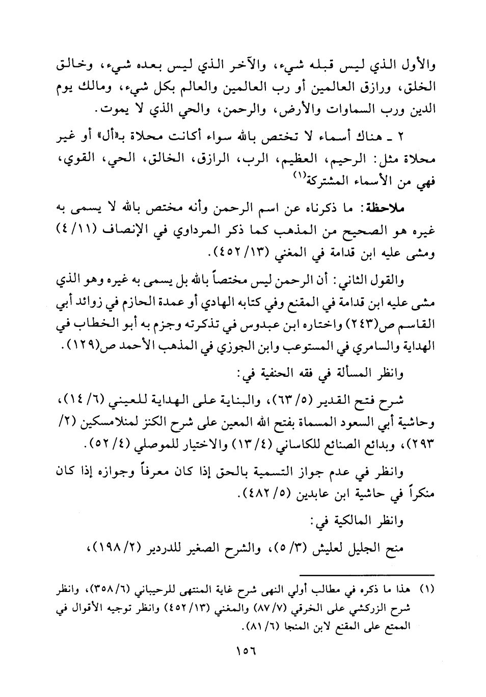ملاحظة: ما ذكرناه عن اسم الرحمن وأنه مختص بالله لا يسمى به غيره هو الصحيح من المذهب كما ذكر المرداوي في الإنصاف (11/4) ومشى عليه ابن قدامة في المغني (13/452) .