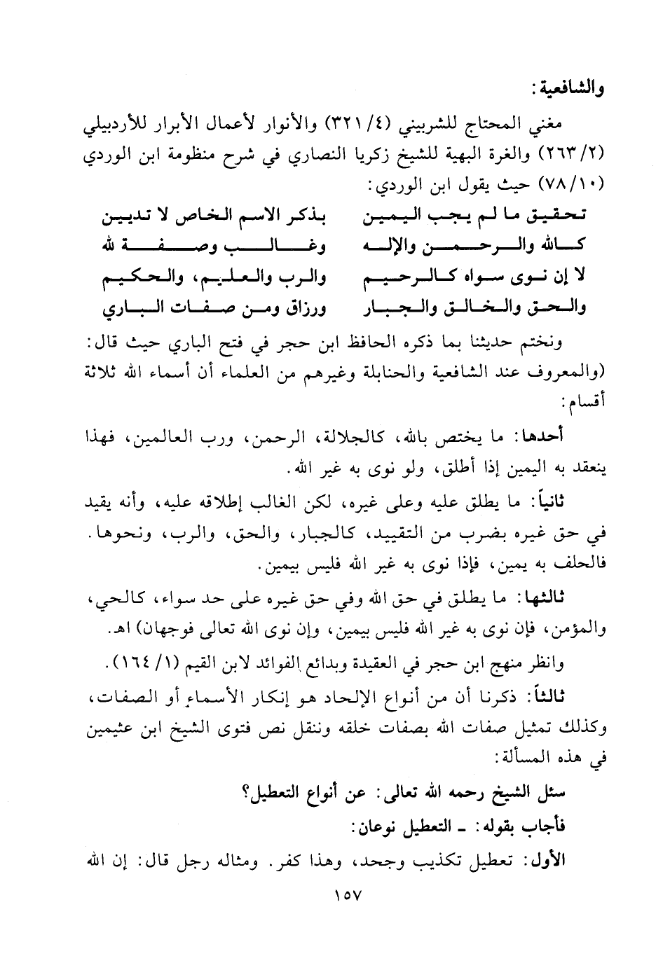 ثالثاً: ذكرنا أن من أنواع الإلحاد هو إنكار الأسماء أو الصفات، وكذلك تمثيل صفات الله بصفات خلقه وننقل نص فتوى الشيخ ابن عثيمين في هذه المسألة: