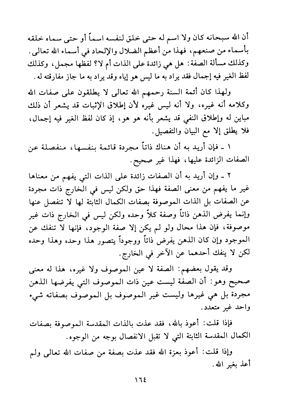 وقد يقول بعضهم: الصفة لا عين الموصوف ولا غيره، هذا له معنى صحيح وهو: أن الصفة ليست عين ذات الموصوف التي يفرضها الذهن مجردة بل هي غيرها وليست غير الموصوف بل الموصوف بصفاته شيء واحد غير متعدد.