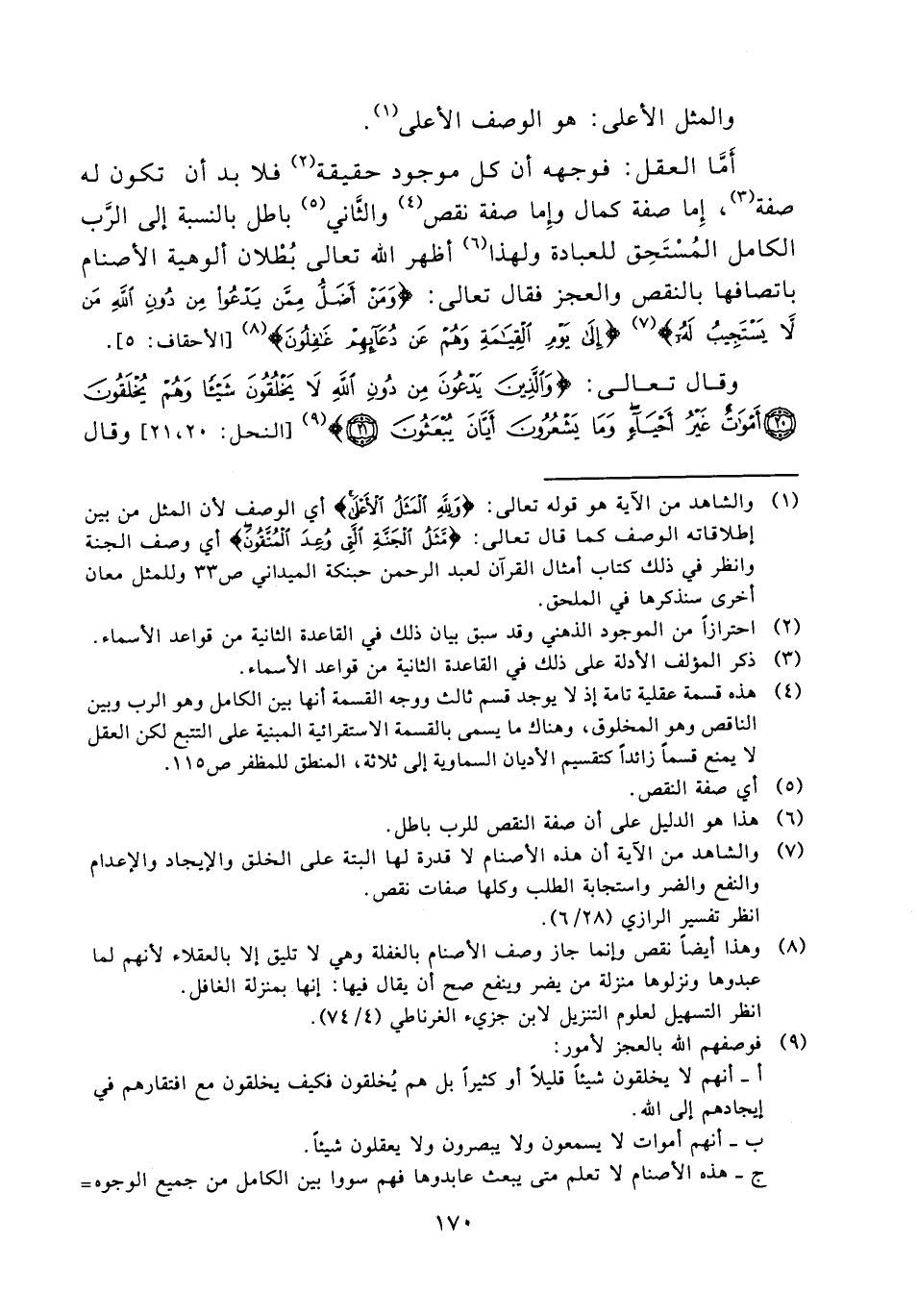 (¬1) والشاهد من الآية هو قوله {ولله المثل الأعلى} أي الوصف لأن المثل من بين انطلاقاته الوصف كما قال تعالى {مثل الجنة التي وعد المتقون} أي وصف الجنة وانظر في ذلك كتاب أمثال القرآن لعبد الرحمن حبنكة الميداني ص 33 وللمثل معان أخرى سنذكرها في الملحق.