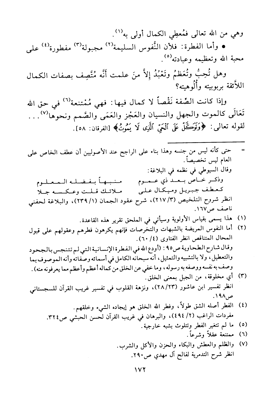 وإذا كانت الصفة نقصاً لا كمال فيها فهي ممتنعة (¬6) في حق الله تعالى كالموت والجهل والنسيان والعجز والعمى والصمم ونحوها (¬7) لقوله تعالى: {وتوكل على الحي الذي لا يموت} [الفرقان: 58]