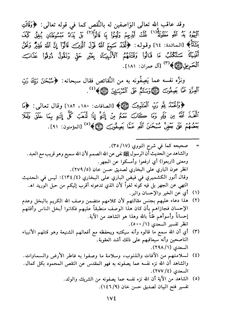 ونزه نفسه عما يصفونه به من النقائص فقال سبحانه: {سبحان ربك رب العزة عما يصفون وسلام على المرسلين (¬4) والحمد لله رب العالمين} [الصافات: 180-182] وقال تعالى: {ما اتخذ الله من ولد وما كان معه من إله إذاً لذهب كل إله بما خلق ولعلا بعضهم على بعض سبحان الله عما يصفون} (¬5) [المؤمنون: 91]