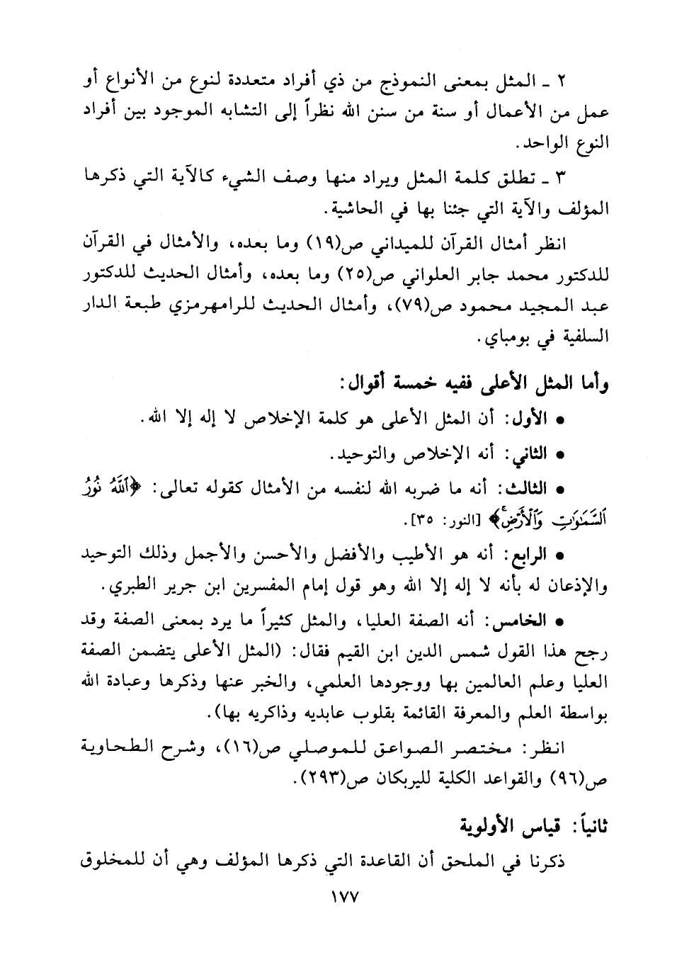 - الخامس: أنه الصفة العليا، والمثل كثيراً ما يرد بمعنى الصفة وقد رجح هذا القول شمس الدين ابن القيم فقال: (المثل الأعلى يتضمن الصفة العليا وعلم العالمين بها ووجودها العلمى، والخبر عنها وذكرها وعبادة الله بواسطة العلم والمعرفة القائمة بقلوب عابديه وذاكريه بها) .