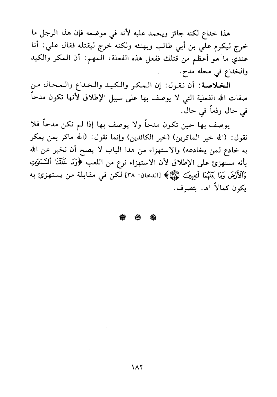 يوصف بها حين تكون مدحاً ولا يوصف بها إذا لم تكن مدحاً فلا نقول: " الله خير الماكرين " " خير الكائدين " وإنما نقول: " الله ماكر بمن يمكر به خادع لمن يخادعه " والاستهزاء من هذا الباب لا يصح أن نخبر عن الله بأنه مستهزئ على الإطلاق لأن الاستهزاء نوع من اللعب {وما خلقنا السماوات والأرض وما بينهما لاعبين} [الدخان: 38] لكن في مقابلة من يستهزئ به يكون كمالاً ا. هـ بتصرف.