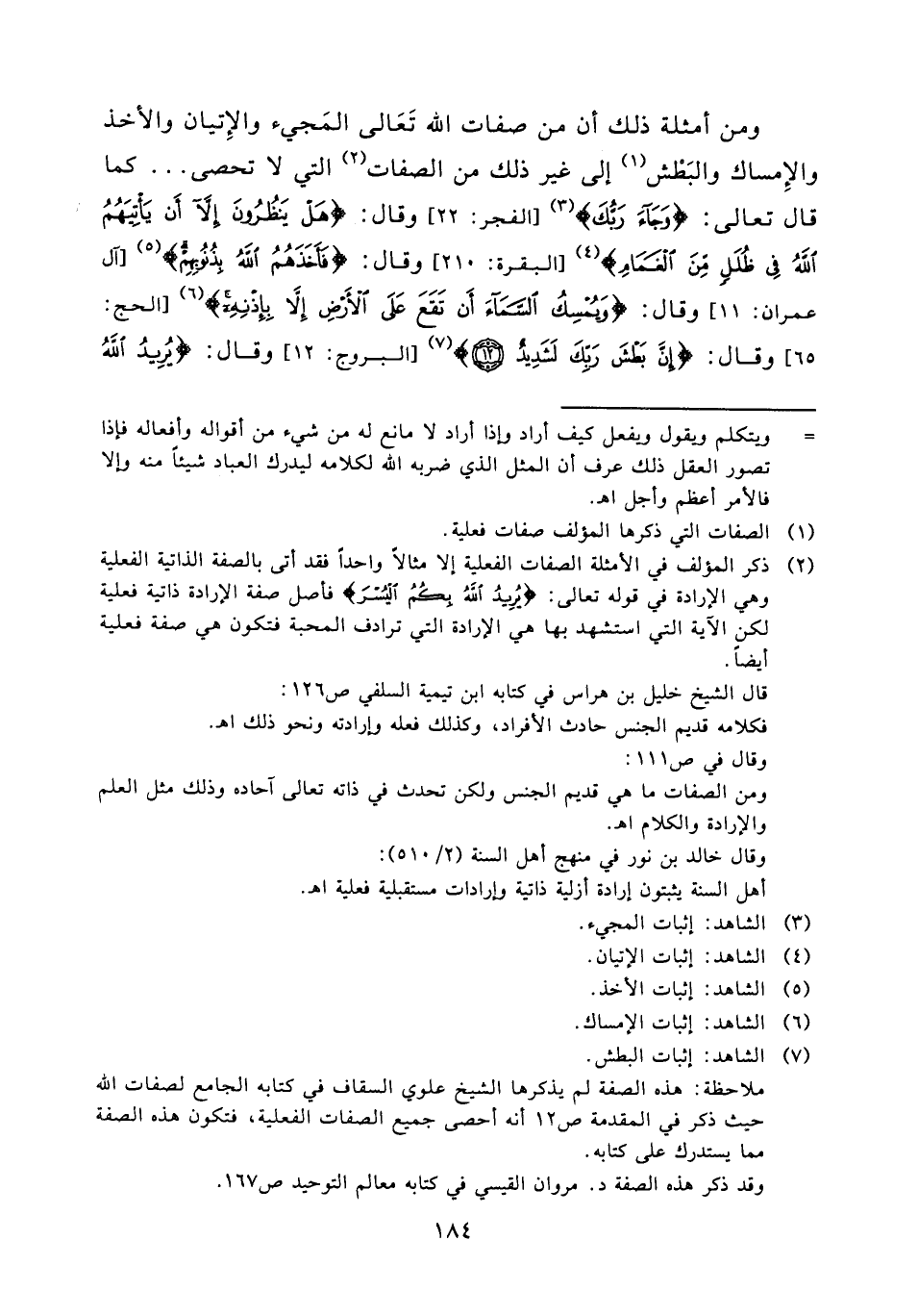 (¬2) ذكر المؤلف في الأمثلة الصفات الفعلية إلا مثالاً واحداً فقد أتى بالصفة الذاتية الفعلية وهي الإرادة في قوله تعالى (يريد الله بكم اليسر) فأصل صفة الإرادة ذاتية فعلية لكن الآية التي استشهد بها هي الإرادة التي ترادف المحبة فتكون هي صفة فعلية أيضاً.