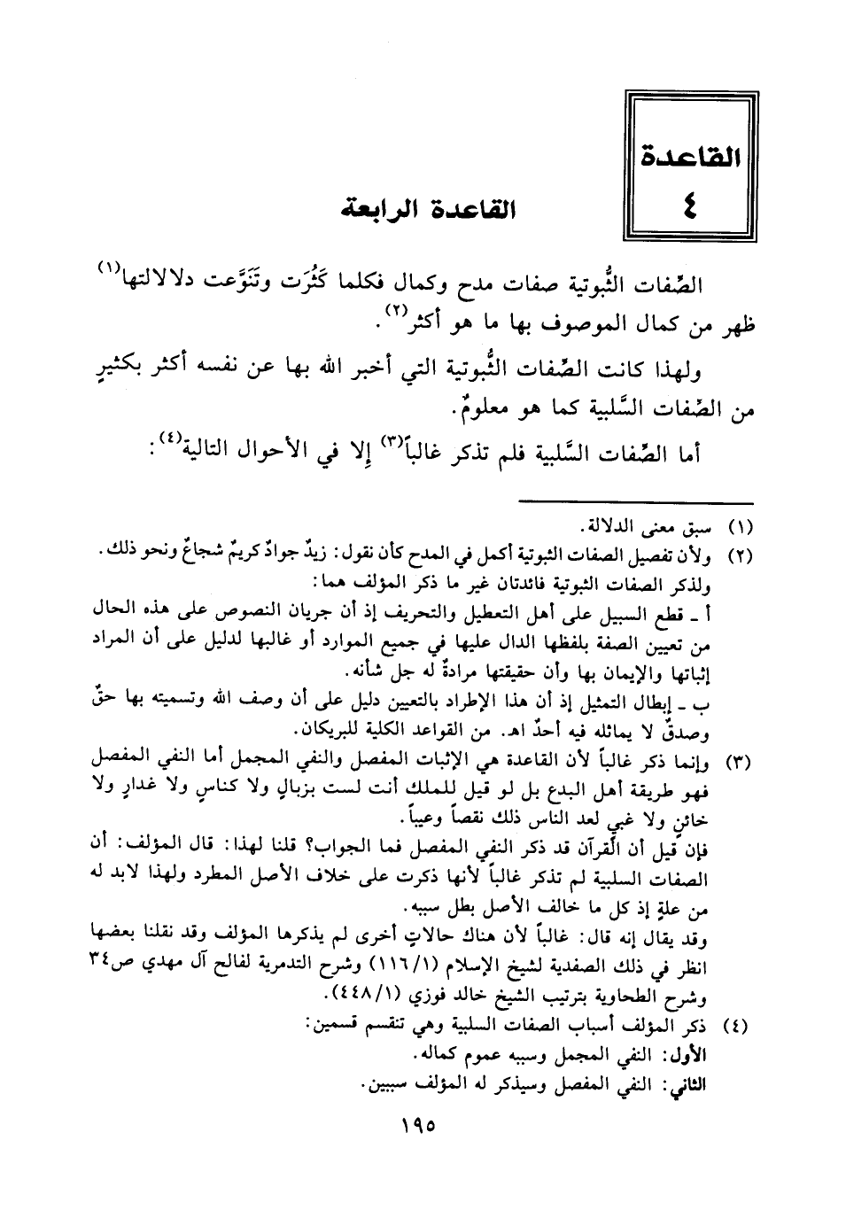 (¬3) وإنما ذكر غالباً لأن القاعدة هي الإثبات المفصل والنفي المجمل أما النفي المفصل فهو طريقة أهل البدع بل لو قيل للملك أنت لست بزبال ولا كناس ولا غدار ولا خائن ولا غبي لعد الناس ذلك نقصاً وعيباً.