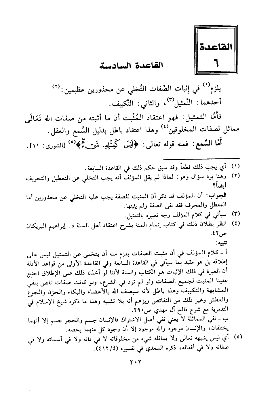 أ - كلام المؤلف في أن مثبت الصفات يلزم منه أن يتخلى عن التمثيل ليس على إطلاقه بل هو مقيد بما سيأتي في القاعدة السابعة وفي القاعدة الأولى من قواعد الأدلة أن العبرة في ذلك الإثبات هو الكتاب والسنة لأننا لو أخذنا ذلك على الإطلاق احتج علينا المثبت لجميع الصفات ولو لم ترد في الشرع ولو كانت صفات نقص بنفي المشابهة والتكييف وهذا باطل لأنه سيصف الله بالأعضاء والبكاء والحزن والجوع والعطش وغير ذلك من النقائص ويزعم أنه بلا تشبيه وهذا ما ذكره شيخ الإسلام في التدمرية مع شرح فالح أل مهدي ص290.