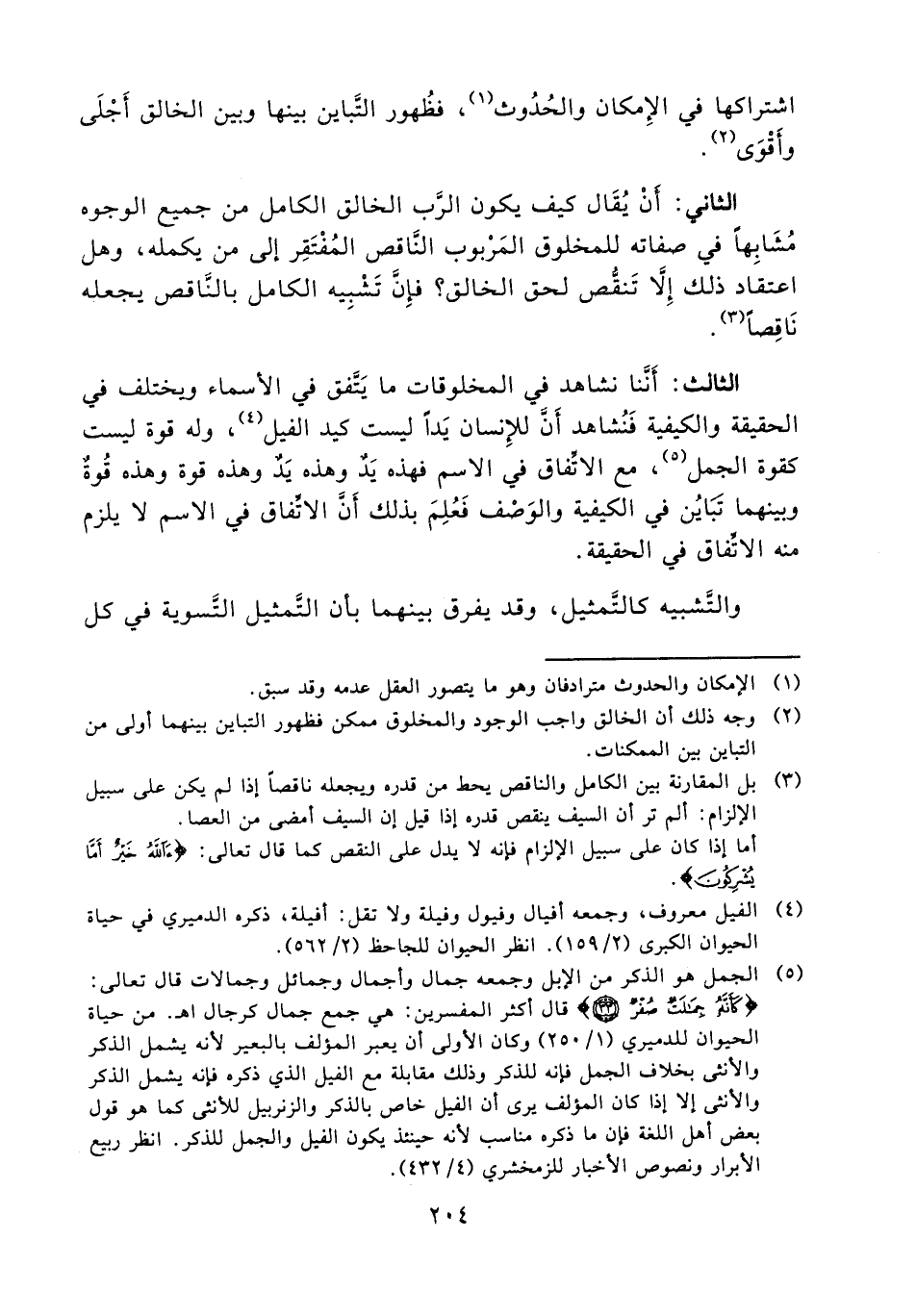 الثاني: أن يقال كيف يكون الرب الخالق الكامل من جميع الوجوه مشابهاً في صفاته للمخلوق في المربوب الناقص المفتقر إلى من يكمله وهل اعتقاد ذلك إلا تنقص لحق الخالق؟ فإن تشبيه الكامل بالناقص يجعله ناقصاً (¬3) . الثالث: أننا نشاهد في المخلوقات ما يتفق في الأسماء ويختلف في