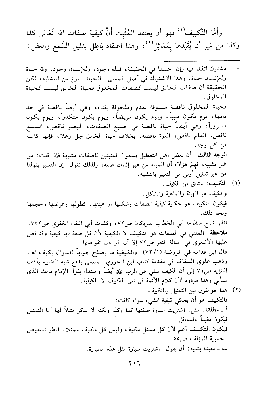 ملاحظة: المنفي في الصفات هو التكييف لا الكيفية لأن كل صفة لها كيفية وقد نص عليها الأشعري في رسالة الثغر ص 72 إلا أن الواجب تفويضها.