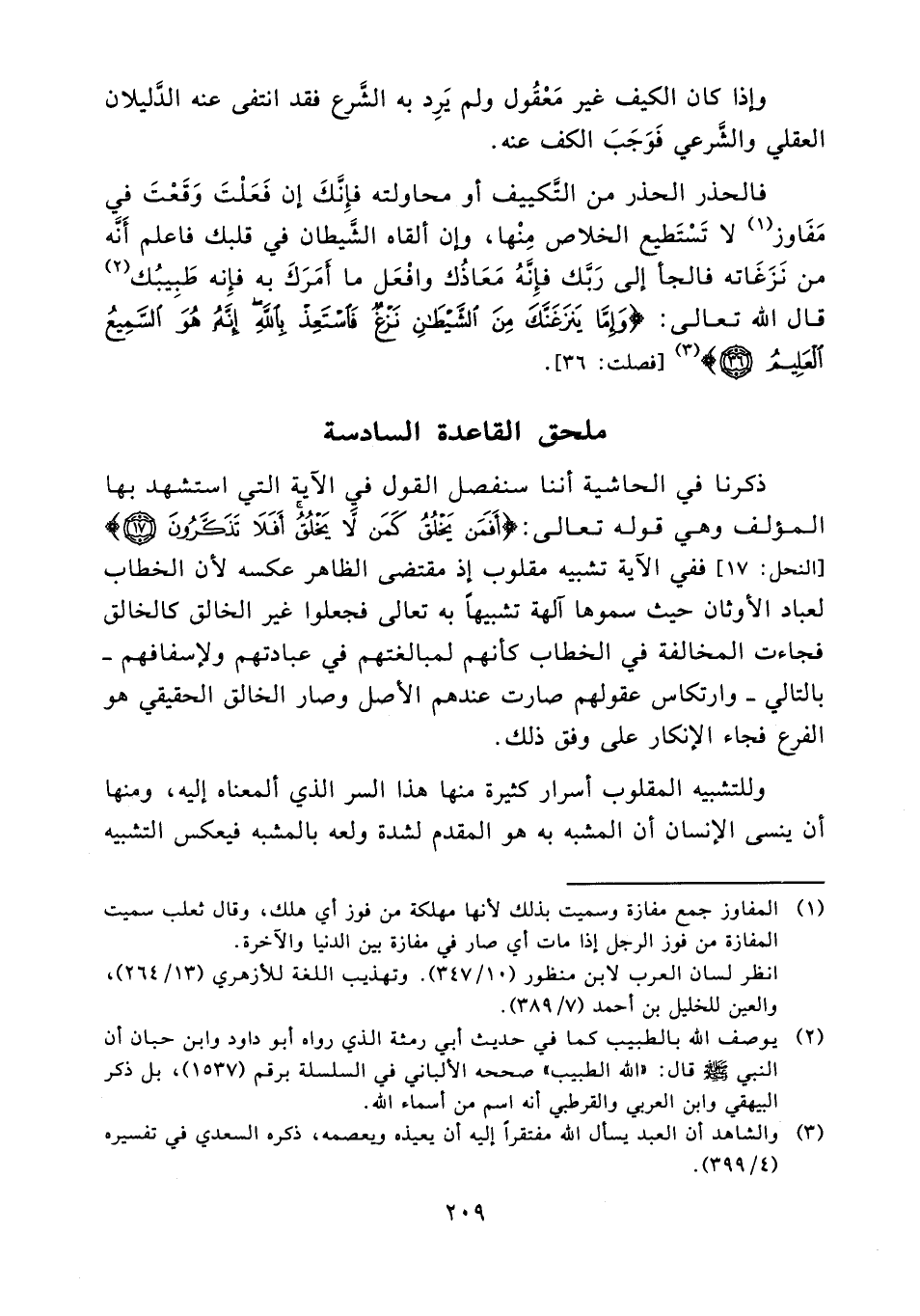 وإذا كان الكيف غير معقول ولم يرد به الشرع فقد انتفى عنه الدليلان العقلي والشرعي فوجب الكف عنه فالحذر الحذر من التكييف أو محاولته فإنك إن فعلت وقعت في مفاوز (¬1) لا تستطيع الخلاص منها وإن ألقاه الشيطان في قلبك فاعلم أنه من نزغاته فالجأ إلى ربك فإنه معاذك وافعل ما أمرك به فإنه طبيبك (¬2) قال الله تعالى: {وإما ينزغنك من الشيطان نزغ فاستعذ بالله إنه هو السميع العليم} (¬3) [فصلت: 36] .