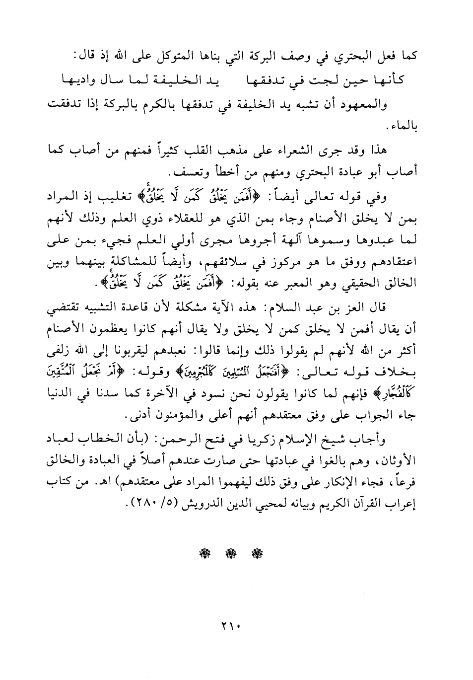 قال العز بن عبد السلام هذه الآية مشكلة لأن قاعدة التشبيه تقتضي أن يقال أفمن لا يخلق كمن يخلق ولا يقال أنهم كانوا يعظمون الأصنام أكثر من الله لأنهم لم يقولوا ذلك وإنما قالوا: نعبدهم ليقربونا إلى الله زلفى بخلاف قوله تعالى: أفنجعل المسلمين كالمجرمين وقوله: أم نجعل المتقين كالفجار فإنهم لما كانوا يقولون نحن نسود في الآخرة كما سدنا في الدنيا جاء الجواب على وفق معتقدهم إنهم أعلى والمؤمنون أدنى.