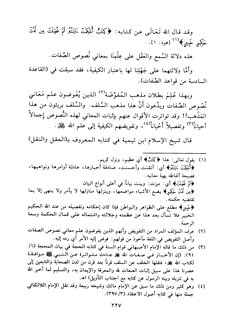 وبهذا علم بطلان مذهب المفوضة (¬2) الذين يفوضون علم معاني نصوص الصفات ويدعون أن هذا مذهب السلف. والسلف بريئون من هذا المذهب وقد تواترت الأقوال عنهم بإثبات المعاني لهذه النصوص إجمالاً أحياناً (¬3)