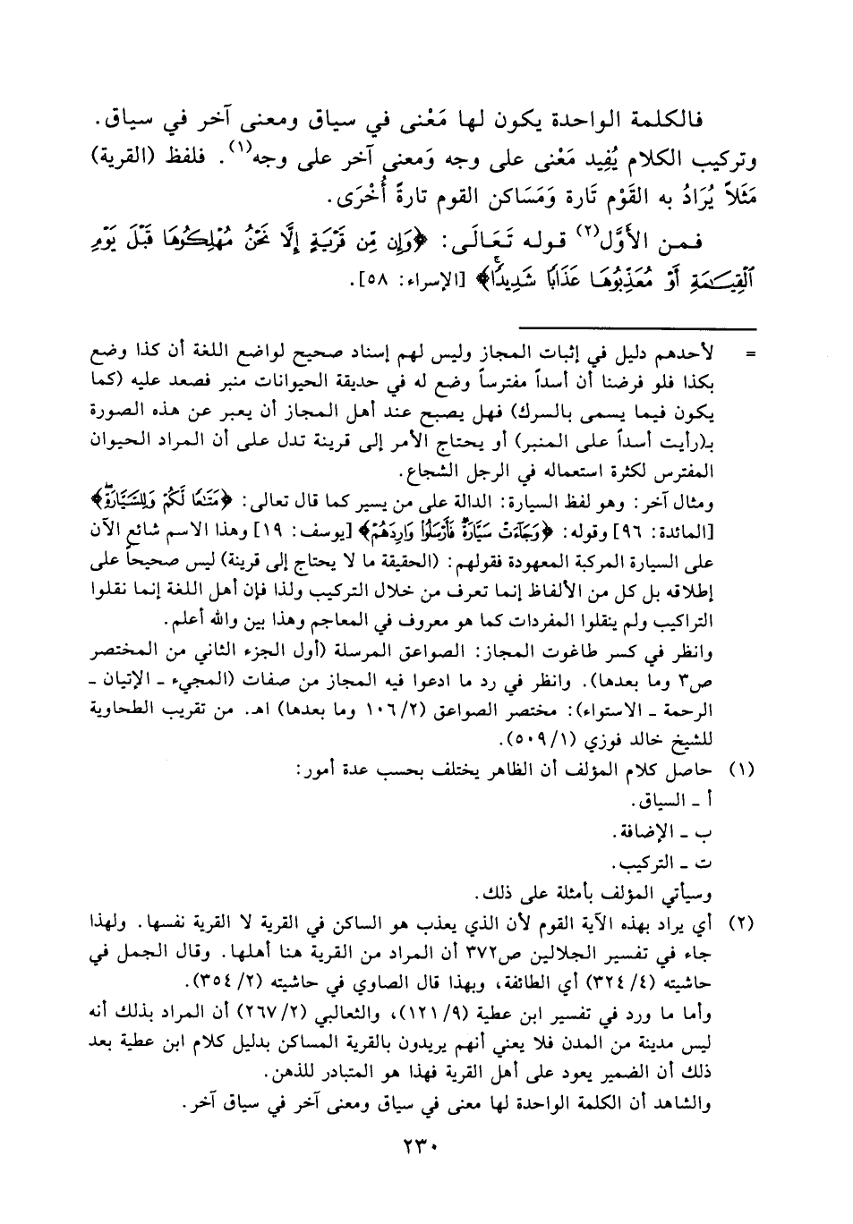 فالكلمة الواحدة يكون لها معنى في سياق ومعنى آخر في سياق وتركيب الكلام يفيد معنى على وجه ومعنى آخر على وجه (¬1) فلفظ (القرية) مثلاً يراد به القوم تارة ومساكن القوم تارة أخرى