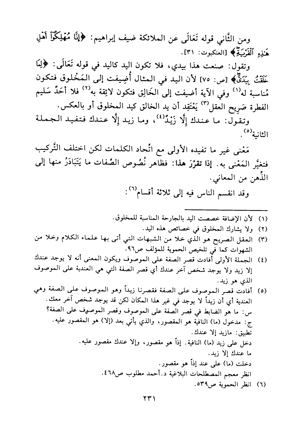 وتقول: صنعت هذا بيدي فلا تكون اليد كاليد في قوله تعالى: {لما خلقت بيدي} [ص:75] لأن اليد في المثال أضيفت إلى المخلوق فتكون مناسبة له (¬1) وفي الآية أضيفت إلى الخالق فتكون لائقة به (¬2) فلا أحد سليم الفطرة صريح العقل (¬3) يعتقد أن يد الخالق كيد المخلوق أو بالعكس وتقول: ما عند ك إلا زيد (¬4) وما زيد إلا عندك فتفيد الجملة الثانية (¬5) معنى غير ما تفيده الأولى مع اتحاد الكلمات لكن اختلف التركيب فتغير المعنى به إذا تقرر هذا فظاهر نصوص الصفات ما يتبادر منها إلى الذهن من المعاني وقد انقسم الناس فيه إلى ثلاثة أقسام (¬6) :..