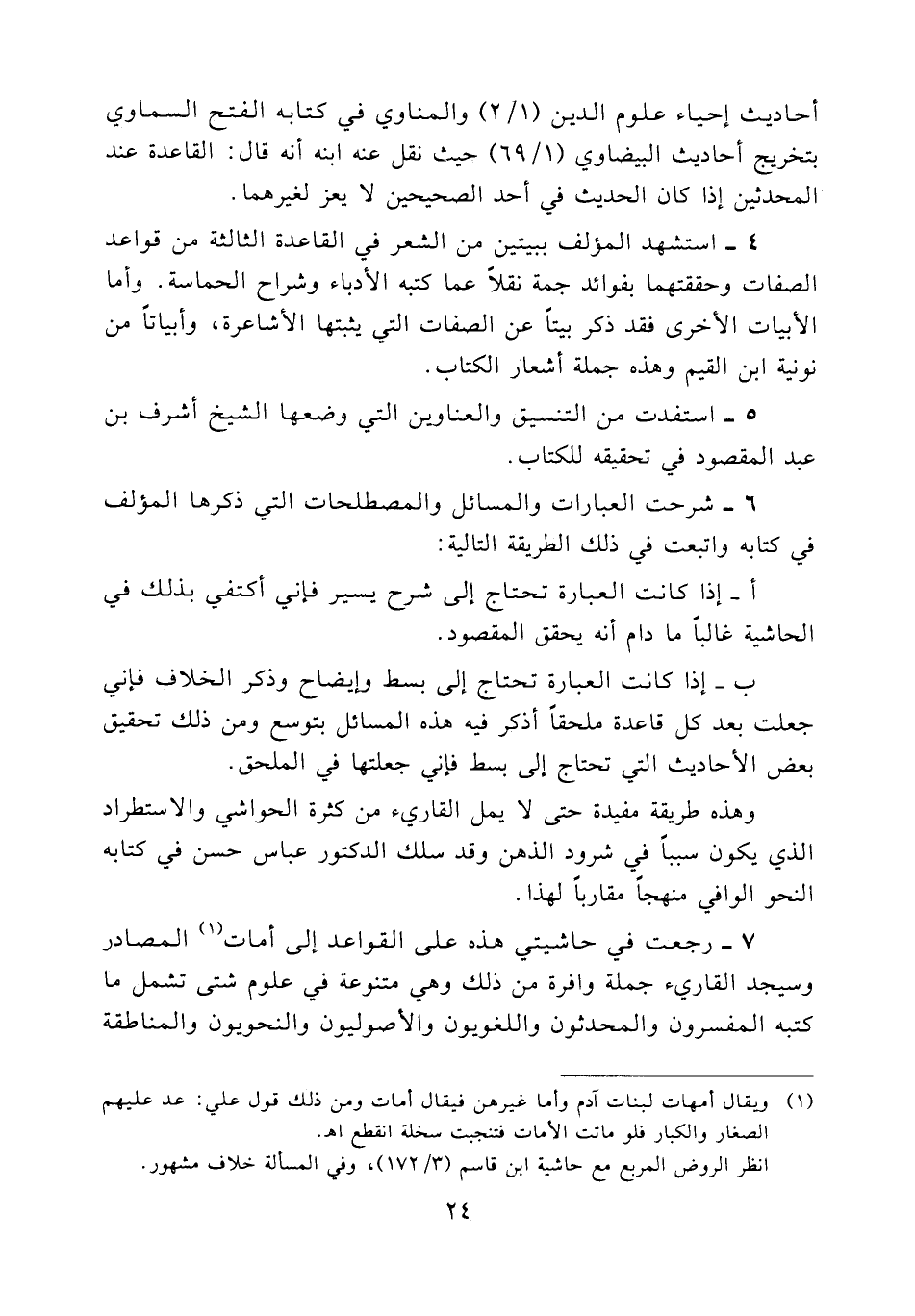 وهذه طريقة مفيدة حتى لا يمل القاريء من كثرة الحواشي والاستطراد الذي يكون سبباً في شرود الذهن وقد سلك الدكتور عباس حسن في كتابه النحو الوافي منهجاً مقارباً لهذا.