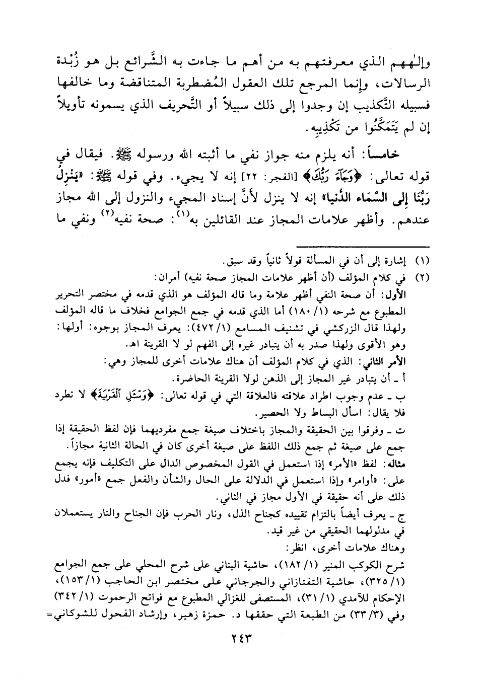 خامساً: أنه يلزم منه جواز نفي ما أثبته الله ورسوله صلى الله عليه وسلم فيقال في قوله تعالى: {وجاء ربك} [الفجر: 22] إنه لا يجيء وفي قوله صلى الله عليه وسلم: " ينزل ربنا إلى السماء الدنيا " إنه لا ينزل لأن إسناد المجيء والنزول إلى الله مجاز عندهم وأظهر علامات المجاز عند القائلين به (¬1) صحة نفيه (¬2)