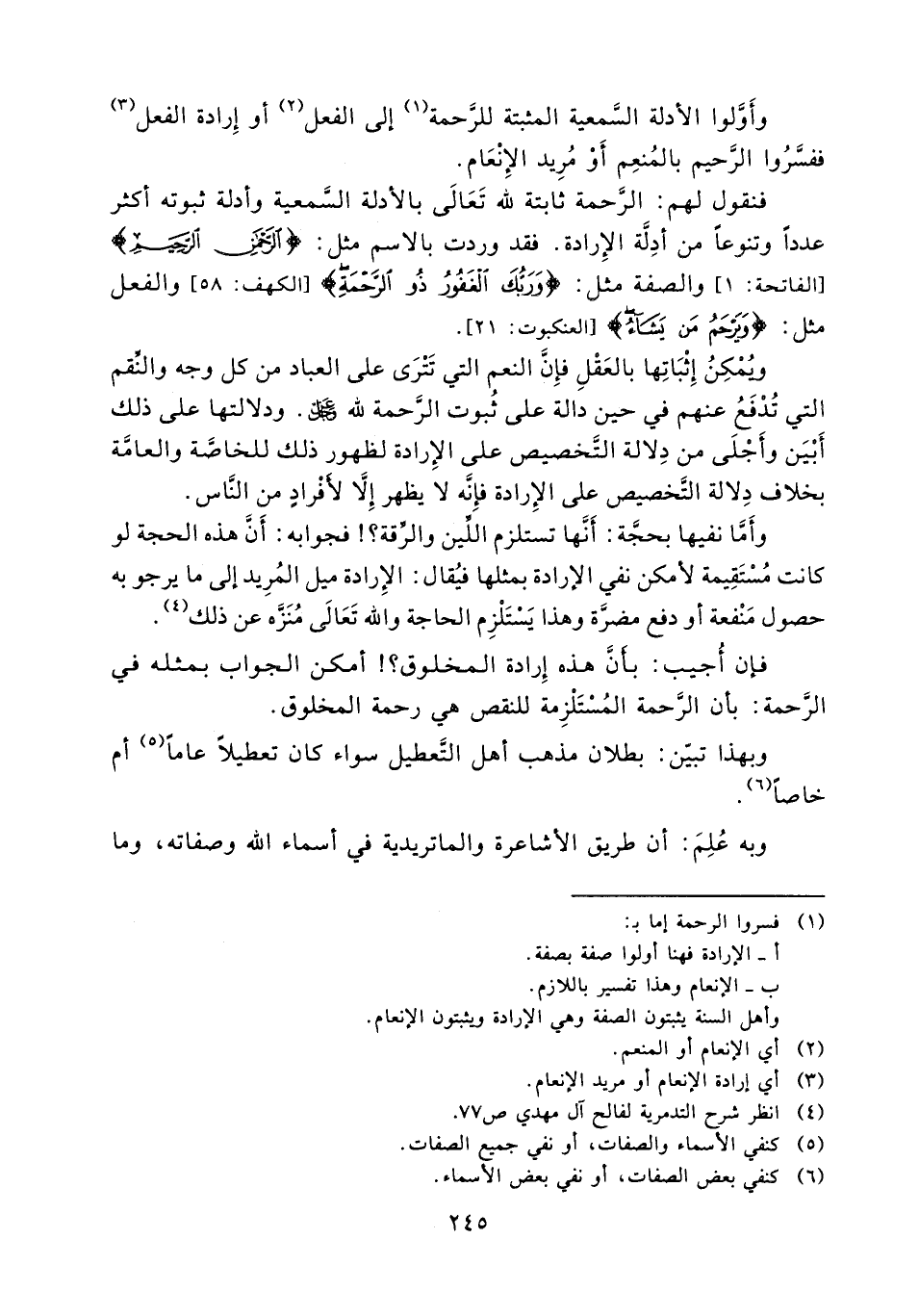 وأما نفيها بحجة أنها تستلزم اللين والرقة فجوابه أن هذه الحجة لو كانت مستقيمة لأمكن نفي الإرادة بمثلها فيقال: الإرادة ميل المريد إلى ما يرجو به حصول منفعة أو دفع مضرة وهذا يستلزم الحاجة والله تعالى منزه عن ذلك (¬4) .