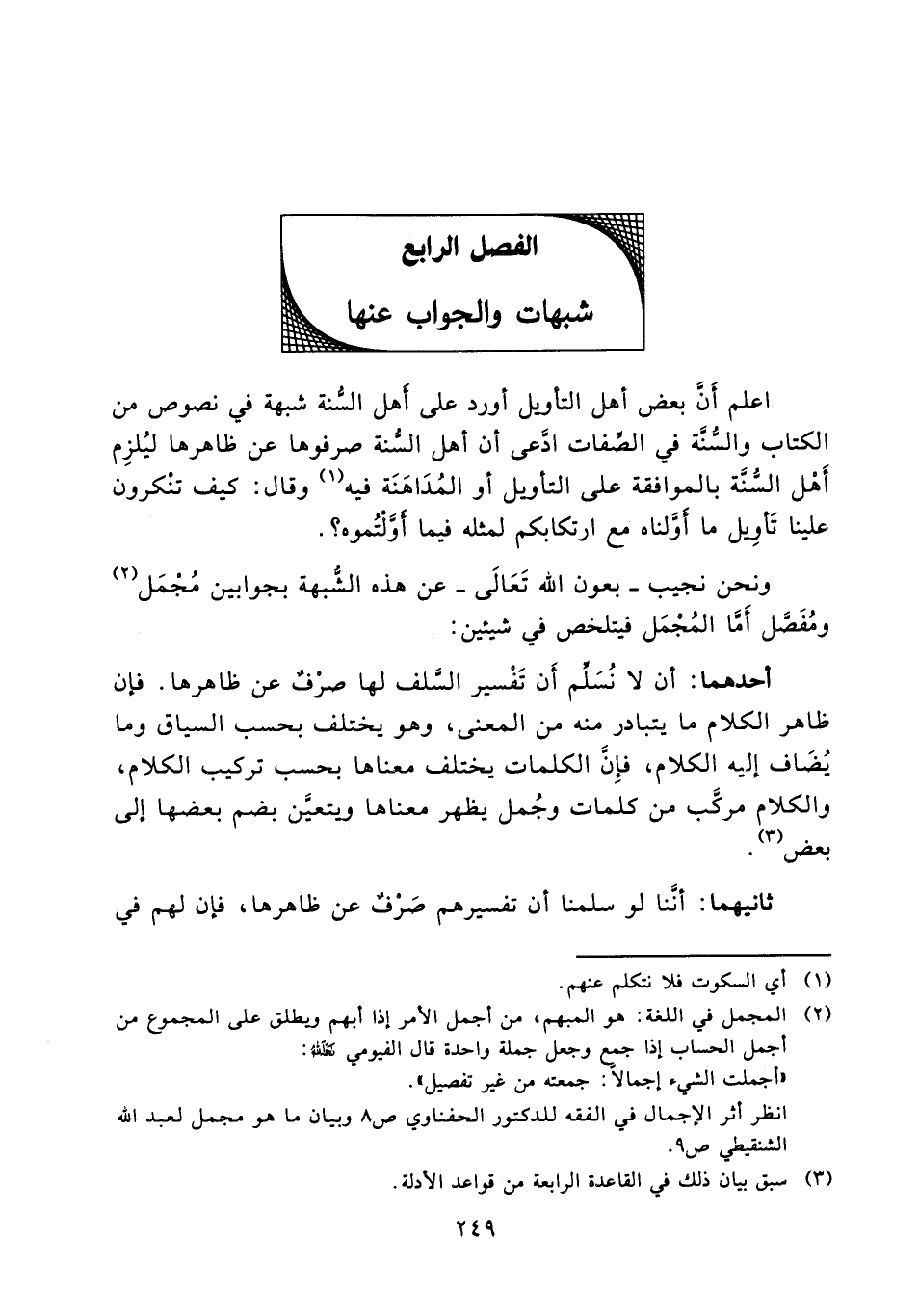 اعلم ان بعض أهل التأويل أورد على أهل السنة شبهة في نصوص من الكتاب والسنة في الصفات ادعى أن أهل السنة صرفوها عن ظاهرها ليلزم أهل السنة بالموافقة على التأويل أو المداهنة فيه (¬1) وقال: كيف تنكرون علينا تأويل ما أولناه مع ارتكابكم لمثله فيما أولتموه؟