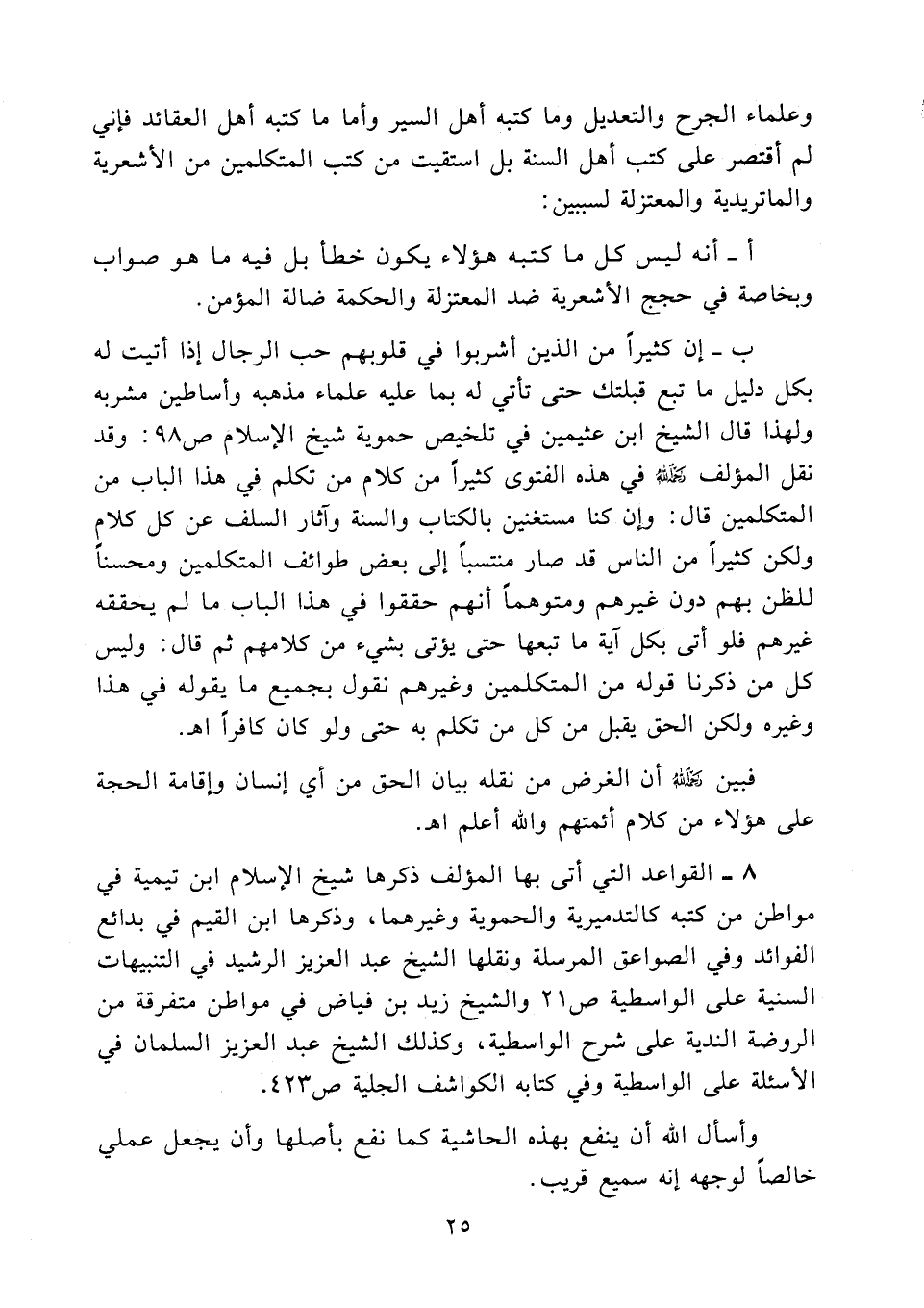 8 - القواعد التي أتي بها المؤلف ذكرها شيخ الإسلام ابن تيمية في مواطن من كتبه كالتدمرية والحموية وغيرهما، وذكرها ابن القيم في بدائع الفوائد وفي الصواعق المرسلة ونقلها الشيخ عبد العزيز الرشيد في التنبيهات السنية على الواسطية ص 21 والشيخ زيد بن فياض في مواطن متفرقة من الروضة الندية على شرح الواسطية. وكذلك الشيخ عبد العزيز السلمان في الأسئلة على الواسطية وفي كتابه الكواشف الجلية ص423.
