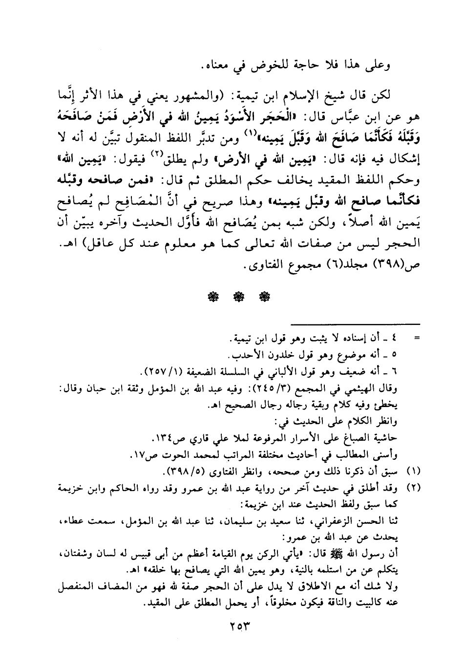 لكن قال شيخ الإسلام ابن تيمية: " والمشهور يعنى في هذا الأثر إنما هو عن ابن عباس قال: " الحجر الأسود يمين الله في الأرض فمن صافحه وقبله فكأنما صافح الله وقبل يمينه " (¬1) ومن تدبر اللفظ المنقول تبين له أنه لا إشكال فيه فإنه قال: " يمين الله في الأرض " ولم يطلق (¬2) فيقول: " يمين الله " وحكم اللفظ المقيد يخالف حكم المطلق ثم قال: " فمن صافحه وقبله فكأنما صافح الله وقبل يمينه " وهذا صريح في أن المصافح لم يصافح يمين الله أصلاً ولكن شبه بمن يصافح الله فأول الحديث وآخره يبين أن الحجر ليس من صفات الله تعالى كما هو معلوم عند كل عاقل " ا. هـ ص (398) مجلد (6) مجموع الفتاوى.