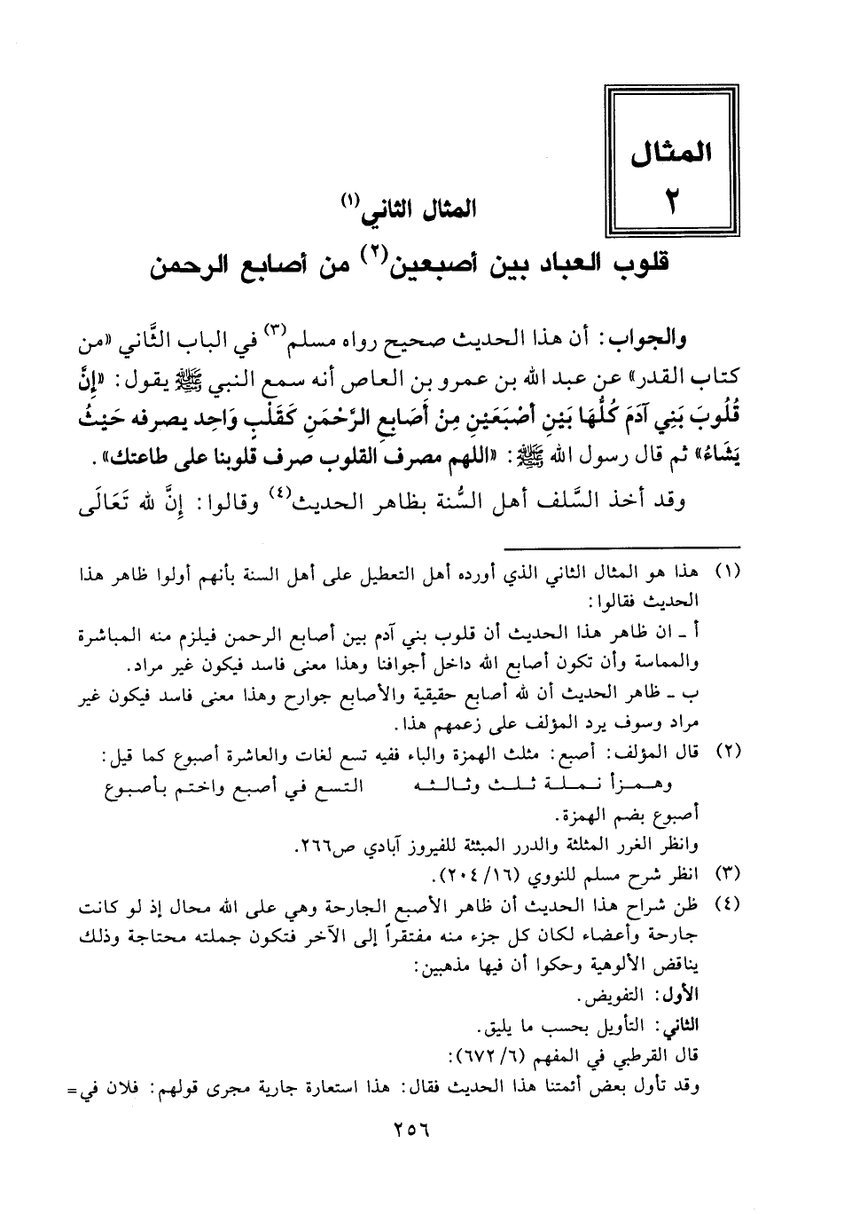 (¬4) ... ظن شراح هذا الحديث ان ظاهر الأصبع الجارحة وهي على الله محال إذ لو كانت جارحة وأعضاء لكان كل جزء منه مفتقراً إلى الآخر فتكون جملته محتاجة وذلك يناقض الألوهية وحكوا أن فيها مذهبين: