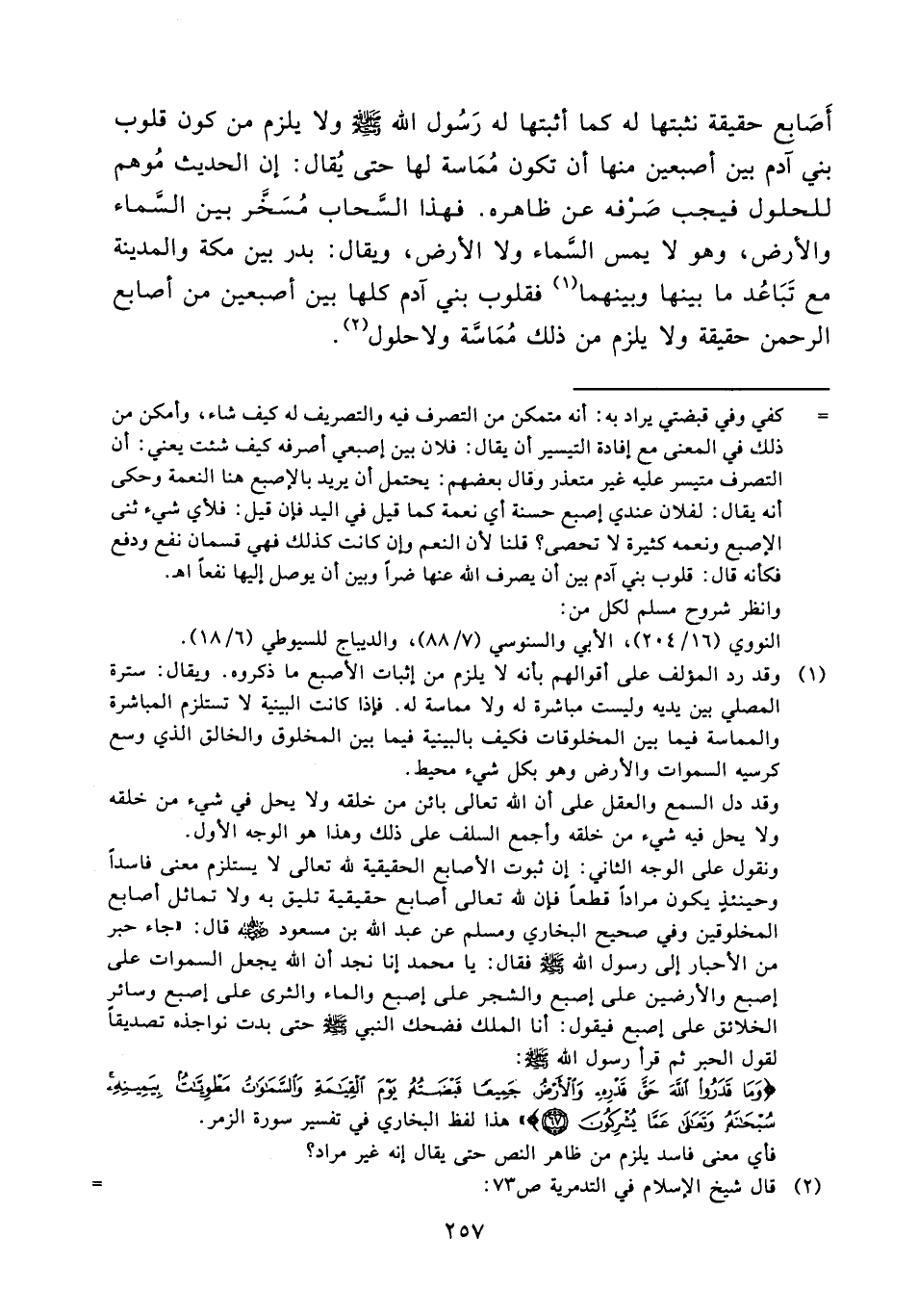 ونقول على الوجه الثاني: إن ثبوت الأصابع الحقيقية لله تعالى لا يستلزم معنى فاسداً وحينئذ يكون مراداً قطعاً فإن لله تعالى أصابع حقيقية تليق به ولا تماثل أصابع المخلوقين وفي صحيح البخاري ومسلم عن عبد الله بن مسعود رضي الله عنه قال: " جاء حبر من الأحبار إلى رسول الله صلى الله عليه وسلم فقال: يا محمد إنا نجد أن الله يجعل السموات على إصبع والأرضيين على إصبع والشجر على إصبع والماء والثرى على إصبع وسائر الخلائق على إصبع فيقول: أنا الملك فضحك النبي صلى الله عليه وسلم حتى بدت نواجذه تصديقاً لقول الحبر ثم قرأ رسول الله صلى الله عليه وسلم: {وما قدروا الله حق قدره والأرض جميعاً قبضته يوم القيامة والسموات = مطويات بيمينه سبحانه وتعالى عما يشركون " هذا لفظ البخاري في تفسير سورة الزمر.