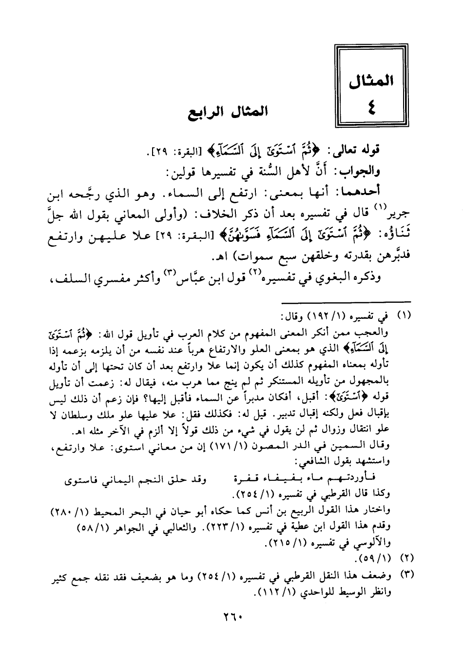 والعجب ممن أنكر المعنى المفهوم من كلام العرب في تأويل قول الله: {ثم استوى إلى السماء} الذي هو بمعنى العلو والارتفاع هرباً عند نفسه من أن يلزمه بزعمه إذا تأوله بمعناه المفهوم كذلك أن يكون إنما علا وارتفع بعد أن كان تحتها إلى أن تأوله بالمجهول من تأويله المستنكر ثم لم ينج مما هرب منه، فيقال له: زعمت أن تأويل قوله {استوى] : أقبل أفكان مدبراً عن السماء فأقبل إليها؟ فان زعم أن ذلك ليس بإقبال فعل ولكنه إقبال تدبير. قيل له: فكذلك فقل: علا عليها علو ملك وسلطان لا علو انتقال وزوال ثم لن يقول في شيء من ذلك قولاً إلا ألزم في الآخر مثله. ا. هـ
