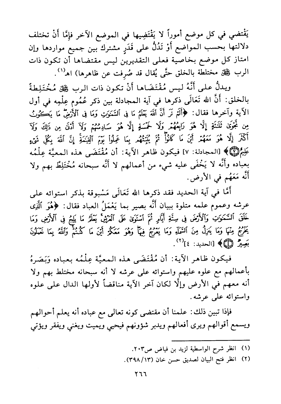 ويدل على أنه ليس مقتضاها أن تكون ذات الرب عز وجل مختلطة بالخلق أن الله تعالى ذكرها في آية المجادلة بين ذكر عموم علمه في أول الآية وآخرها فقال: {ألم تر أن الله يعلم ما في السموات وما في الأرض ما يكون من نجوى ثلاثة إلا هو رابعهم ولا خمسة إلا هو سادسهم ولا أدنى من ذلك ولا أكثر إلا هو معهم أينما كانوا ثم ينبئهم بما عملوا يوم القيامة إن الله بكل شيء عليم} [المجادلة: 7] فيكون ظاهر الآية أن مقتضى هذه المعية علمه بعباده وأنه لا يخفى عليه شيء من أعمالهم لا أنه سبحانه مختلط بهم ولا أنه معهم في الأرض أما في آية الحديد فقد ذكرها الله تعالى مسبوقة بذكر استوائه على عرشه