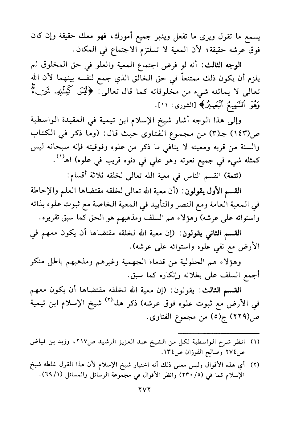 القسم الثالث يقولون: " إن معية الله لخلقه مقتضاها أن يكون معهم في الأرض مع ثبوت علوه فوق عرشه " ذكر هذا (¬2) شيخ الإسلام ابن تيمية ص (229) ج (5) من مجموع الفتاوى.
