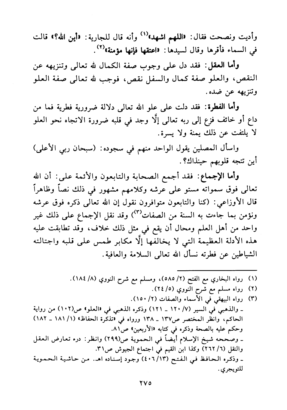 - وصححه شيخ الإسلام أيضاً في الحموية ص (299) وانظر: درء تعارض العقل والنقل (6/262) وكذا ابن القيم في اجتماع الجيوش ص31.