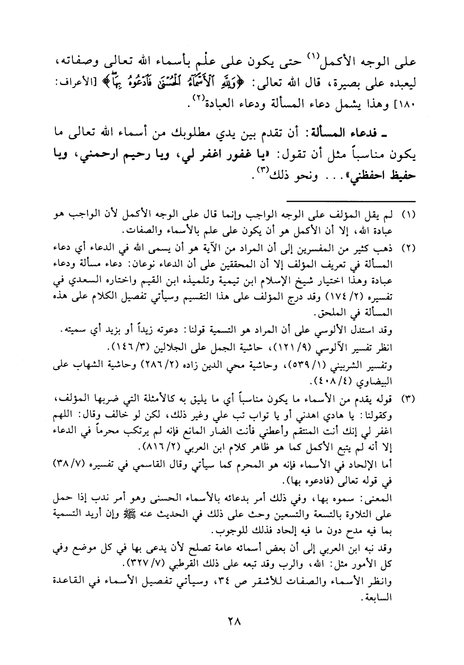 (¬2) ذهب كثير من المفسرين إلى أن المراد من الآية هو أن يسمى الله في الدعاء أي دعاء المسألة في تعريف المؤلف إلا أن المحققين على أن الدعاء نوعان: دعاء مسألة ودعاء عبادة وهذا اختيار شيخ الإسلام ابن تيمية وتلميذه ابن القيم واختاره السعدي في تفسيره (2/174) وقد درج المؤلف على هذا التقسيم وسيأتي تفصيل الكلام على هذه المسألة في الملحق