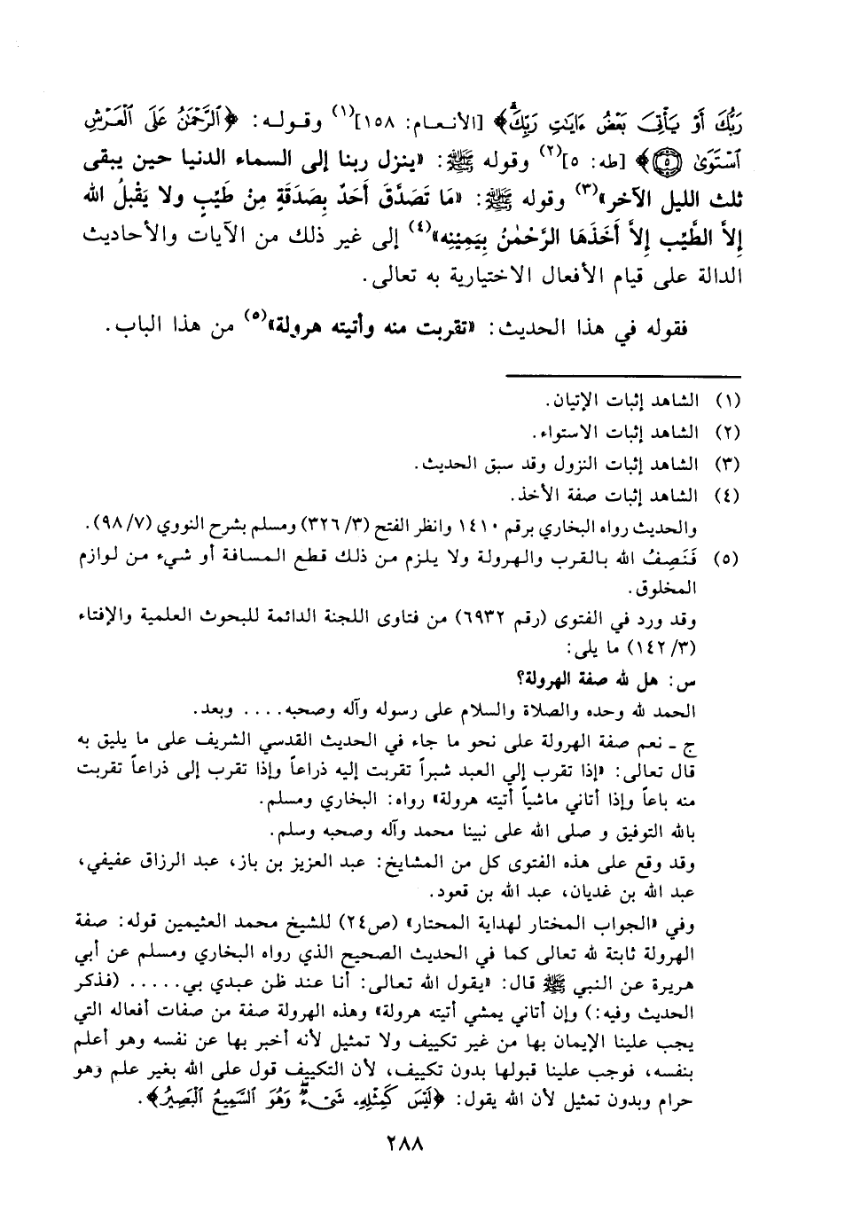 (¬5) فنصف الله بالقرب والهرولة ولا يلزم من ذلك قطع المسافة أو شيء من لوازم المخلوق.