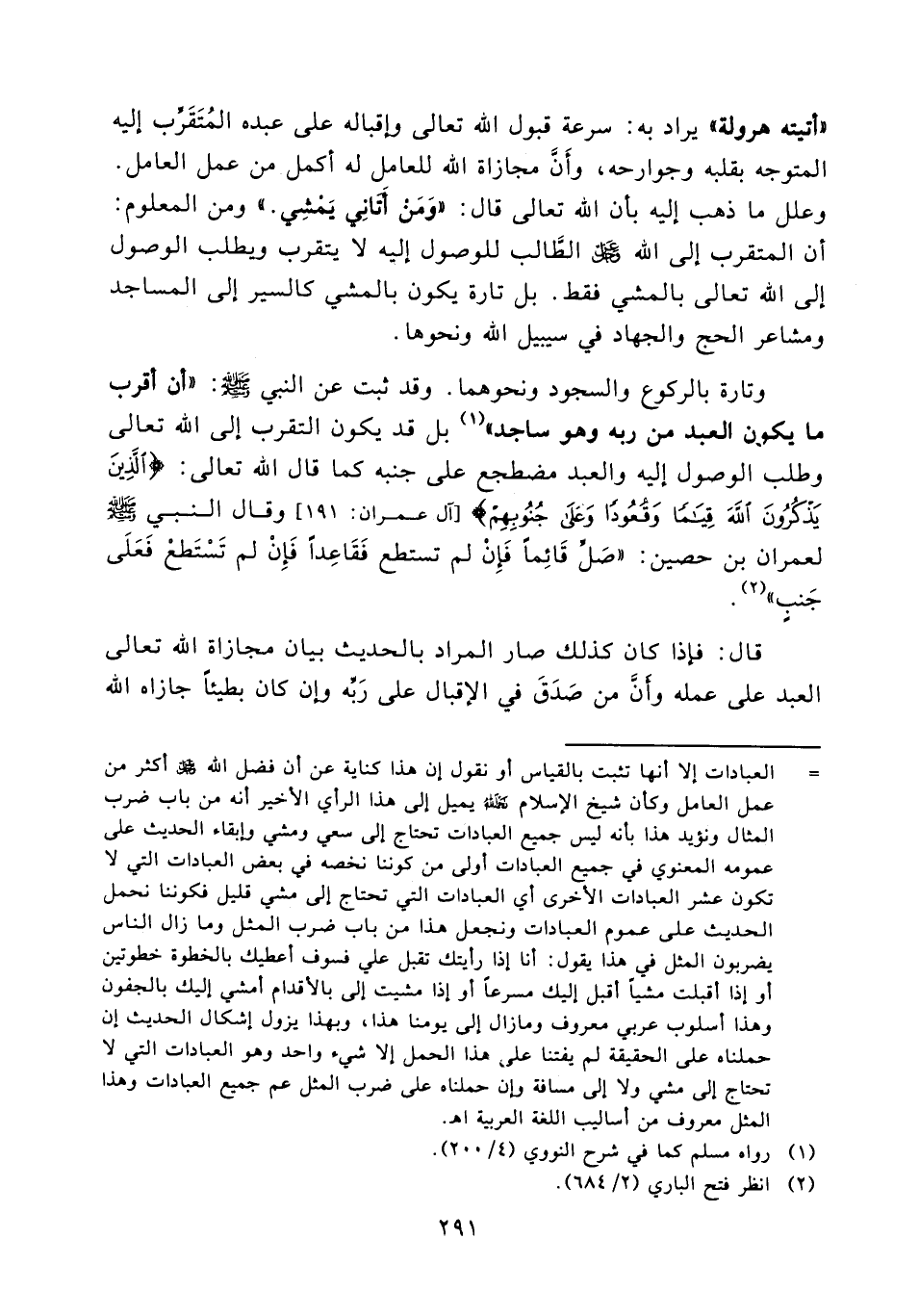 أتيته هرولة " يراد به سرعة قبول الله تعالى وإقباله على عبده المتقرب إلى المساجد ومشاعر الحجج والجهاد في سبيل الله ونحوها وتارة بالركوع والسجود ونحوهما. وقد ثبت عن النبي صلى الله عليه وسلم: " أن أقرب ما يكون العبد من ربه وهو ساجد " (¬1) بل قد يكون التقرب إلى الله تعالى وطلب الوصول إليه والعبد مضطجع على جنبه كما قال الله تعالى: {الذين يذكرون الله قياماً وقعوداً وعلى جنوبهم} [آل عمران: 191] وقال النبي صلى الله عليه وسلم لعمران بن حصين: " صل قائماً فإن لم تستطع فقاعداً فإن لم تستطع فعلى جنب " (¬2) .