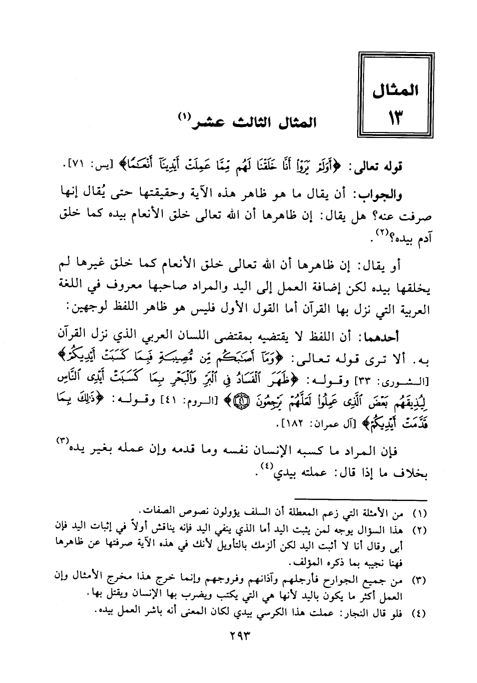 (¬2) هذا السؤال يوجه لمن يثبت اليد أما الذي ينفي اليد فإنه يناقش أولاً في إثبات اليد فإن أبى وقال أنا لا اثبت اليد لكن ألزمك بالتأويل لأنك في هذه الآية صرفتها عن ظاهرها فهنا نجيبه بما ذكره المؤلف.