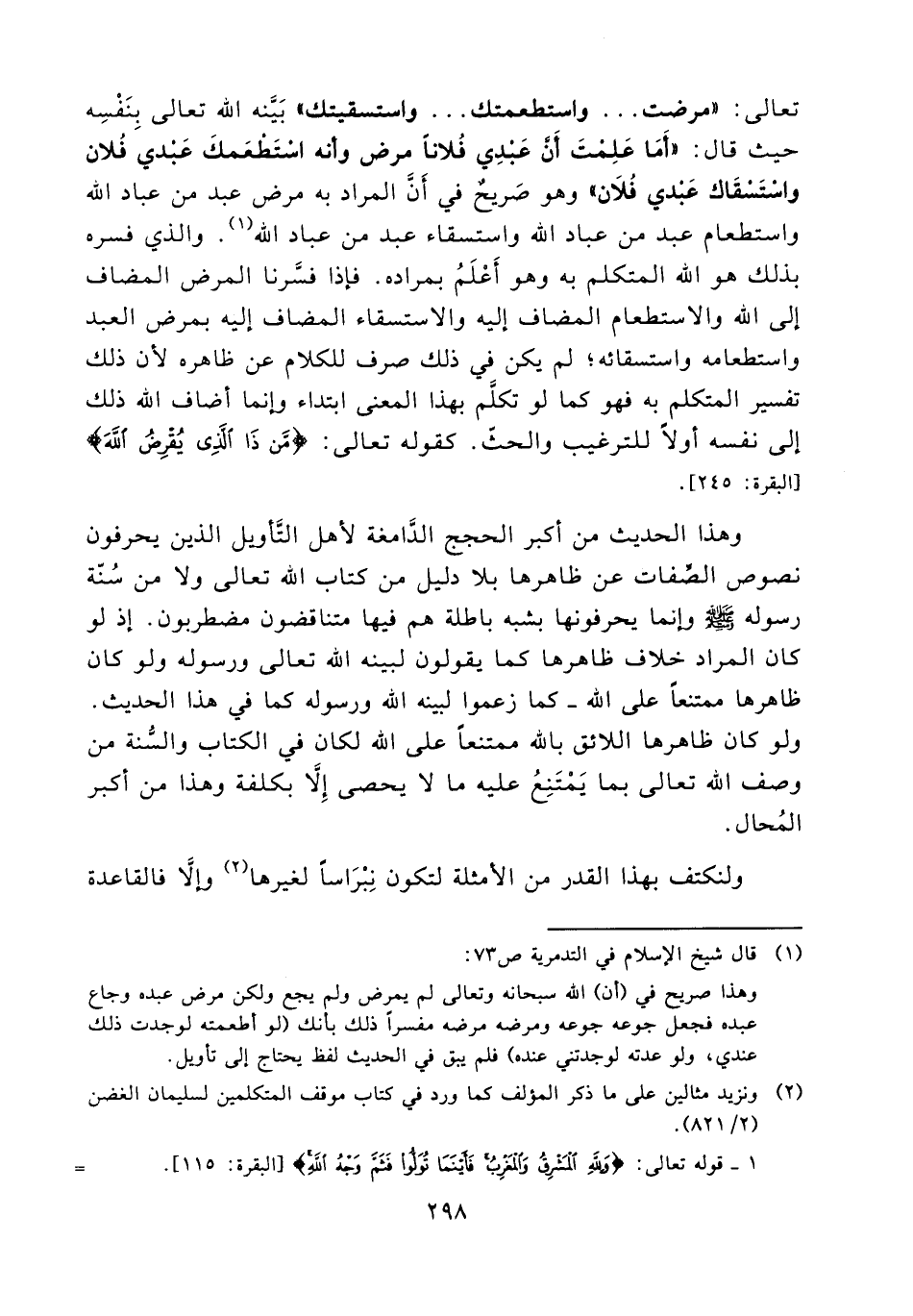وهذا صريح في (أن) الله سبحانه وتعالى لم يمرض ولم يجع ولكن مرض عبده وجاع عبده فجعل جوعه ومرضه مرضه مفسراً ذلك بأنك (لو أطعمته لوجدت ذلك عندي، ولو عدته لوجدتني عنده) فلم يبق في الحديث لفظ يحتاج إلى تأويل.