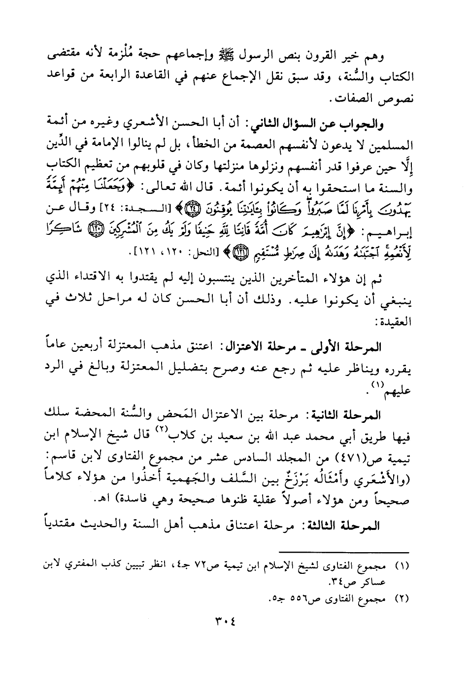 ثم إن هؤلاء المتأخرين الذين ينتسبون إليه لم يقتدوا به الاقتداء الذي ينبغي أن يكونوا عليه وذلك أن أبا الحسن كان له مراحل ثلاث في العقيدة المرحلة الأولى - مرحلة الاعتزال: اعتنق مذهب المعتزلة أربعين عاماً يقرره ويناظر عليه ثم رجع عنه وصرح بتضليل المعتزلة وبالغ في الرد عليهم. (¬1) .