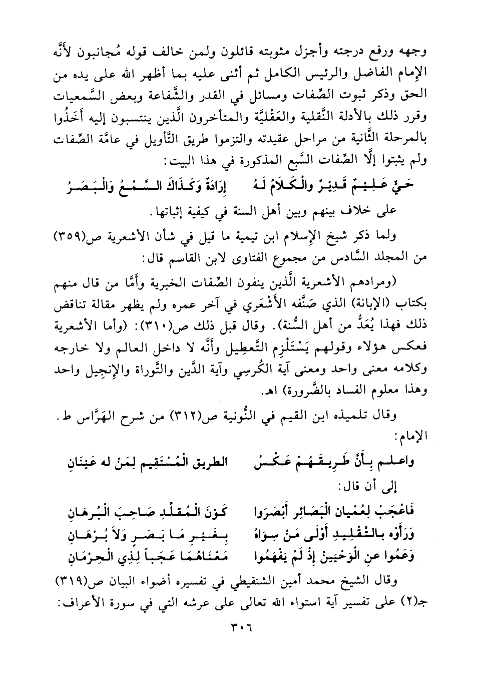 " ومرادهم الأشعرية الذين ينفون الصفات الخبرية وأما من قال منهم بكتاب (الإبانة) الذي صنفه الأشعري في آخر عمره ولم يظهر مقالة تناقض ذلك فهذا يعد من أهل السنة " وقال قبل ذلك ص (310) : " وأما ألأشعرية فعكس هؤلاء وقولهم يستلزم التعطيل وأنه لا داخل العالم ولا خارجه وكلامه معنى واحد ومعنى آية الكرسي وآية الدين والتوراة والإنجيل واحد وهذا معلوم الفساد بالضرورة " ا. هـ