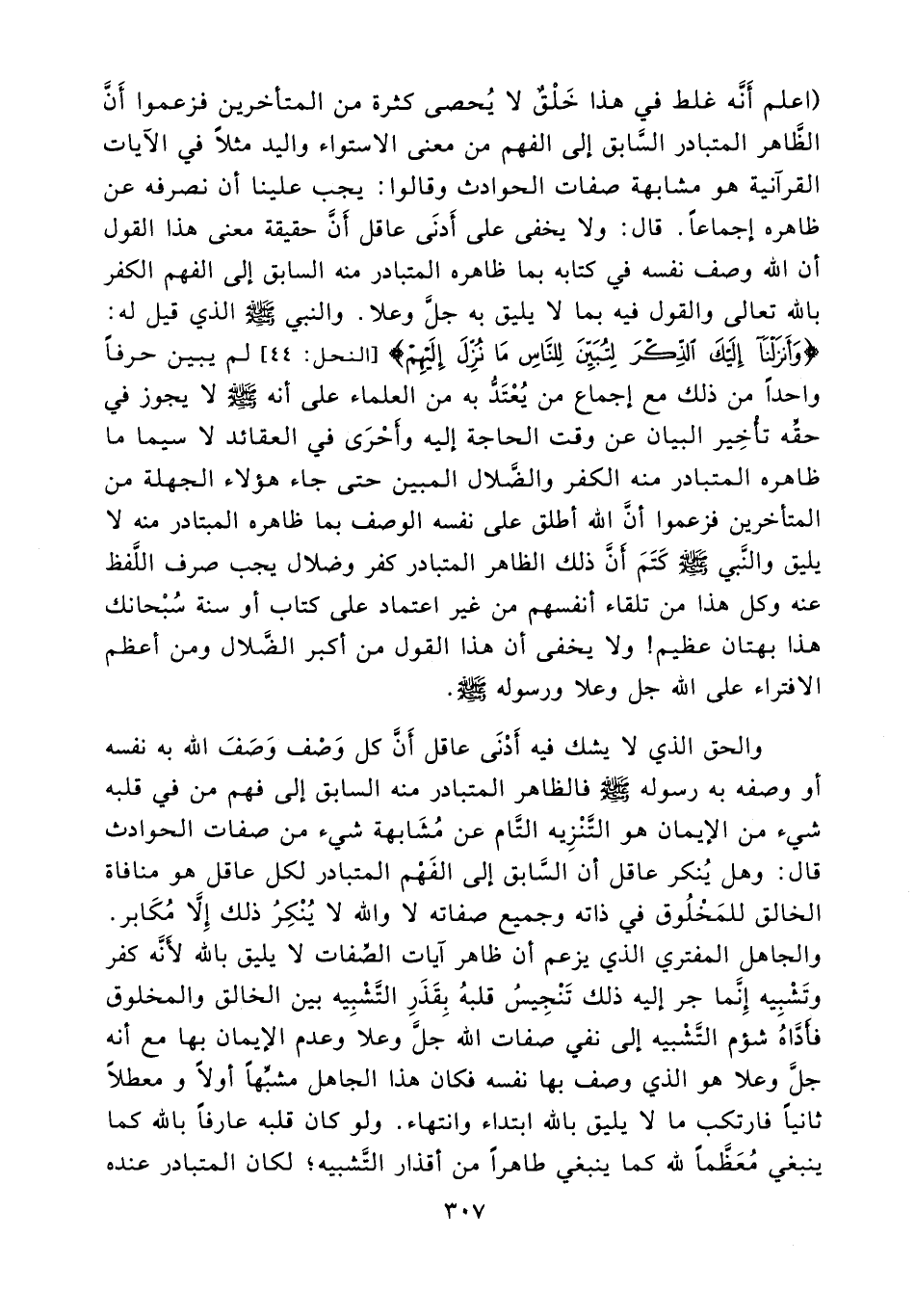 " اعلم أنه غلط في هذا خلق لا يحصى كثرة من المتأخرين فزعموا أن الظاهر المتبادر السابق إلى الفهم من معنى الاستواء واليد مثلاً في الآيات القرآنية هو مشابهة صفات الحوادث وقالوا يجب علينا أن نصرفه عن ظاهره إجماعاً قال: ولا يخفي على أدنى عاقل أن حقيقة معنى هذا القول أن الله وصف نفسه في كتابه بما ظاهره المتبادر منه السابق إلى الفهم الكفر بالله تعالى والقول فيه بما لا يليق به جل وعلا والنبي صلى الله عليه وسلم الذي قيل له: {وأنزلنا إليك الذكر لتبين للناس ما نزل إليهم} [النحل: 44] لم يبين حرفاً واحداً من ذلك مع إجماع من يعتد به من العلماء على أنه صلى الله عليه وسلم لا يجوز في حقه تأخير البيان عن وقت الحاجة إليه وأحرى في العقائد لا سيما ما ظاهره المتبادر منه الكفر والضلال المبين حتى جاء هؤلاء الجهلة من المتأخرين فزعموا أن الله أطلق على نفسه الوصف بما ظاهره المتبادر منه لا يليق والنبي صلى الله عليه وسلم كتم أن ذلك الظاهر المتبادر كفر وضلال يجب صرف اللفظ عنه وكل هذا من تلقاء أنفسهم من غير اعتماد على كتاب أو سنة سبحانك هذا بهتان عظيم! ولا يخفى أن هذا القول من أكبر الضلال ومن أعظم الافتراء على الله جل وعلا ورسوله صلى الله عليه وسلم.