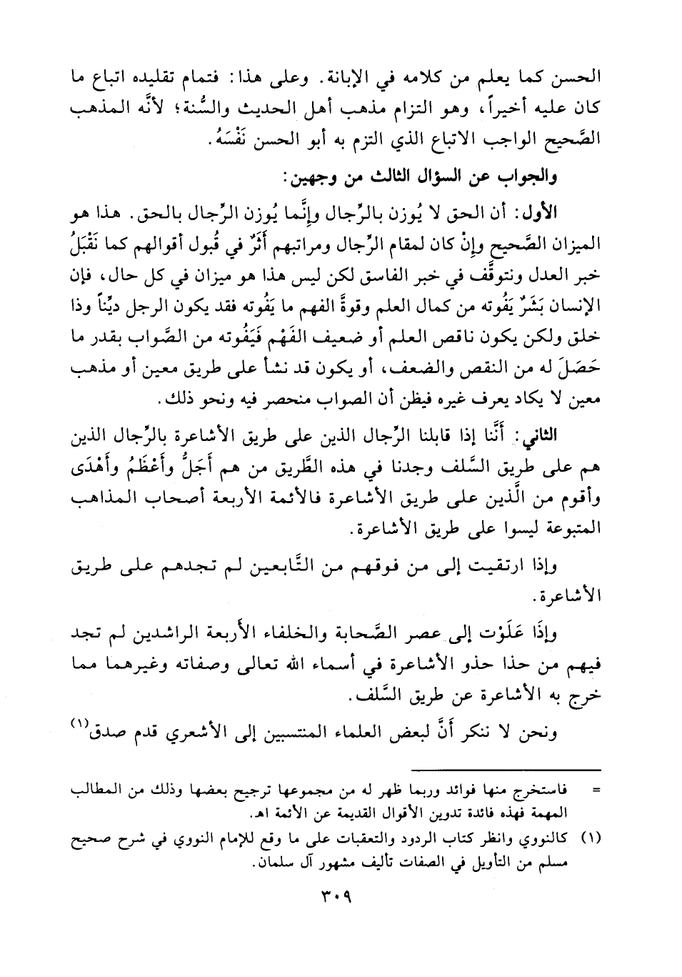 الثاني: أننا إذا قابلنا الرجال الذين على طريق الأشاعرة بالرجال الذين هم على طريق السلف وجدنا في هذه الطريق من هم أجل وأعظم وأهدى وأقوم من الذين على طريق الأشاعرة فالأئمة الأربعة أصحاب المذاهب المتبوعة ليسوا على طريق الأشاعرة.