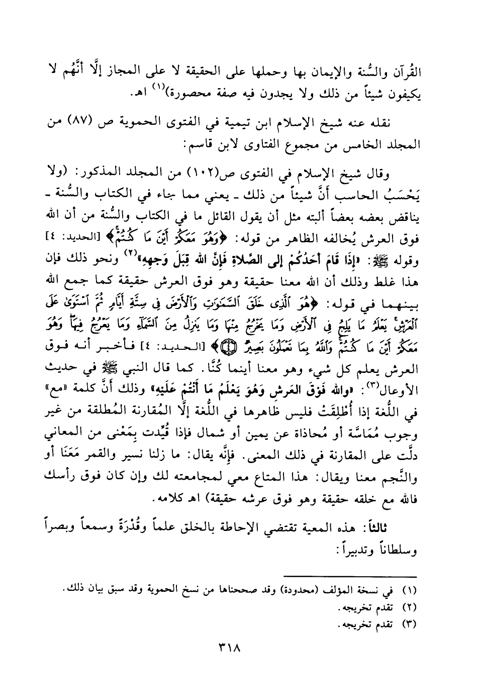 وقال شيخ الإسلام في الفتوى ص (102) من المجلد المذكور: " ولا يحسب الحاسب أن شيئاً من ذلك - يعنى مما جاء في الكتاب والسنة - يناقض بعضه بعضا ألبته مثل أن يقول القائل ما في الكتاب والسنة من أن الله فوق العرش يخالفه الظاهر من قوله: {وهو معكم أينما كنتم} [الحديد: 4] وقوله صلى الله عليه وسلم: " إذا قام أحدكم إلى الصلاة فإن الله قبل وجهه " (¬2) ونحو ذلك فإن هذا غلط وذلك أن الله معنا حقيقة وهو فوق العرش حقيقة كما جمع الله بينهما في قوله: {هو الذي خلق السموات والأرض في ستة أيام ثم استوى على العرش يعلم ما يلج في الأرض وما يخرج منها وما ينزل من السماء وما يعرج فيها وهو معكم أينما كنتم والله بما تعملون بصير} [الحديد: 4] فأخبر أنه فوق العرش يعلم كل شيء وهو معنا أينما كنا كما قال النبي صلى الله عليه وسلم في حديث الأوعال (¬3) : " والله فوق العرش وهو يعلم ما أنتم عليه " وذلك أن كلمة " مع " في اللغة إذا أطلقت فليس ظاهرها في اللغة إلا المقارنة المطلقة من غير وجوب مماسة أو محاذاة عن يمين أو شمال فإذا قيدت بمعنى من المعاني دلت على المقارنة في ذلك المعنى فانه يقال: ما زلنا نسير والقمر معنا أو والنجم معنا ويقال: هذا المتاع معي لمجامعته لك وإن كان فوق رأسك فالله مع خلقه حقيقة وهو فوق عرشه حقيقة " ا. هـ