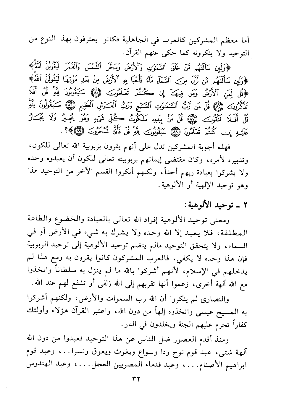 أما معظم المشركين كالعرب في الجاهلية فكانوا يعترفون بهذا النوع من التوحيد ولا ينكرونه كما حكى عنهم القرآن.