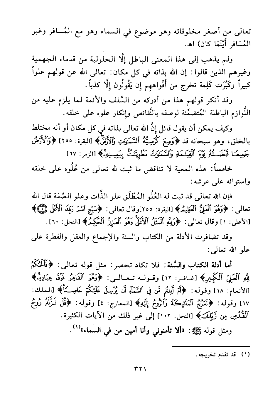 فإن الله تعالى قد ثبت له العلو المطلق علو الذات وعلو الصفة قال الله تعالى: {وهو العلى العظيم} [البقرة: 255] وقال تعالى: {سبح اسم ربك الأعلى} [الأعلى: 1] وقال تعالى: {ولله المثل الأعلى وهو العزيز الحكيم} [النحل: 60] .
