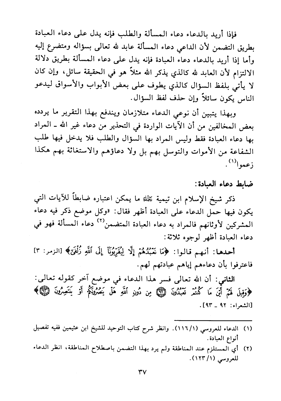 وبهذا يتبين أن نوعي الدعاء متلازمان ويندفع بهذا التقرير ما يردده بعض المخالفين من أن الآيات الواردة في التحذير من دعاء غير الله - المراد بها دعاء العبادة فقط وليس المراد بها السؤال والطلب فلا يدخل فيها طلب الشفاعة من الأموات والتوسل بهم بل ولا دعاؤهم والاستغاثة بهم هكذا زعموا (¬1)