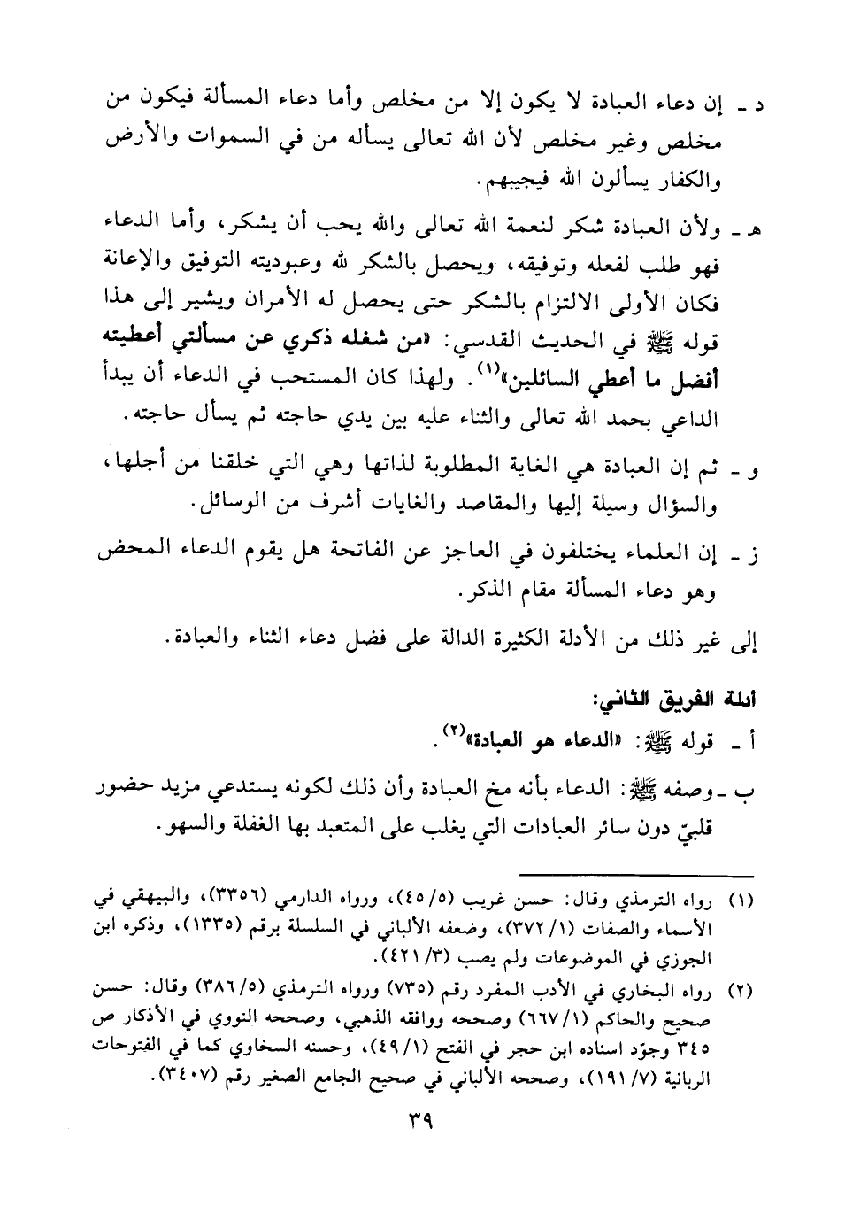ز - ... إن العلماء يختلفون في العاجز عن الفاتحة هل يقوم الدعاء المحض وهو دعاء المسألة مقام الذكر، إلي غير ذلك من الأدلة الكثيرة الدالة على فضل دعاء الثناء والعبادة